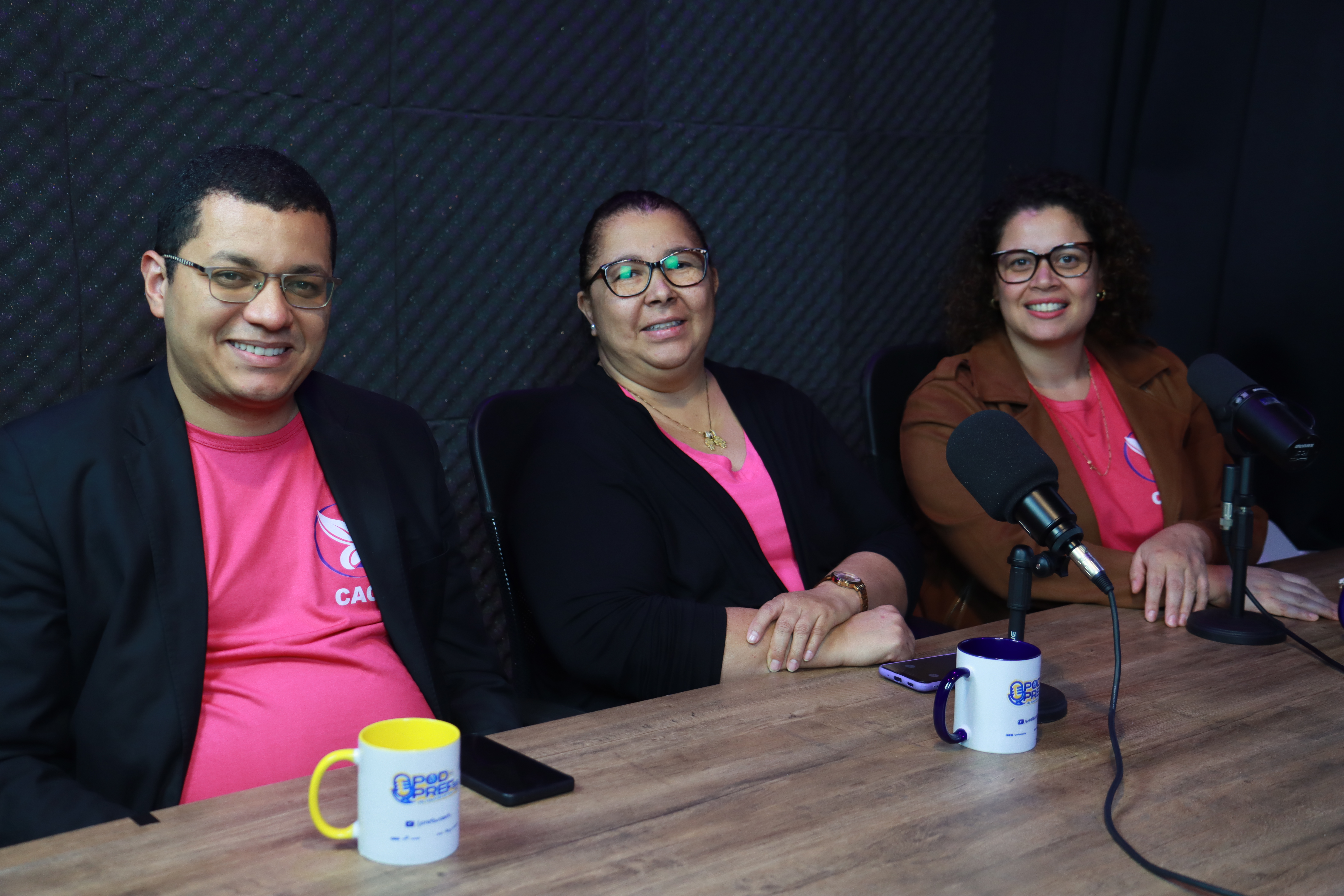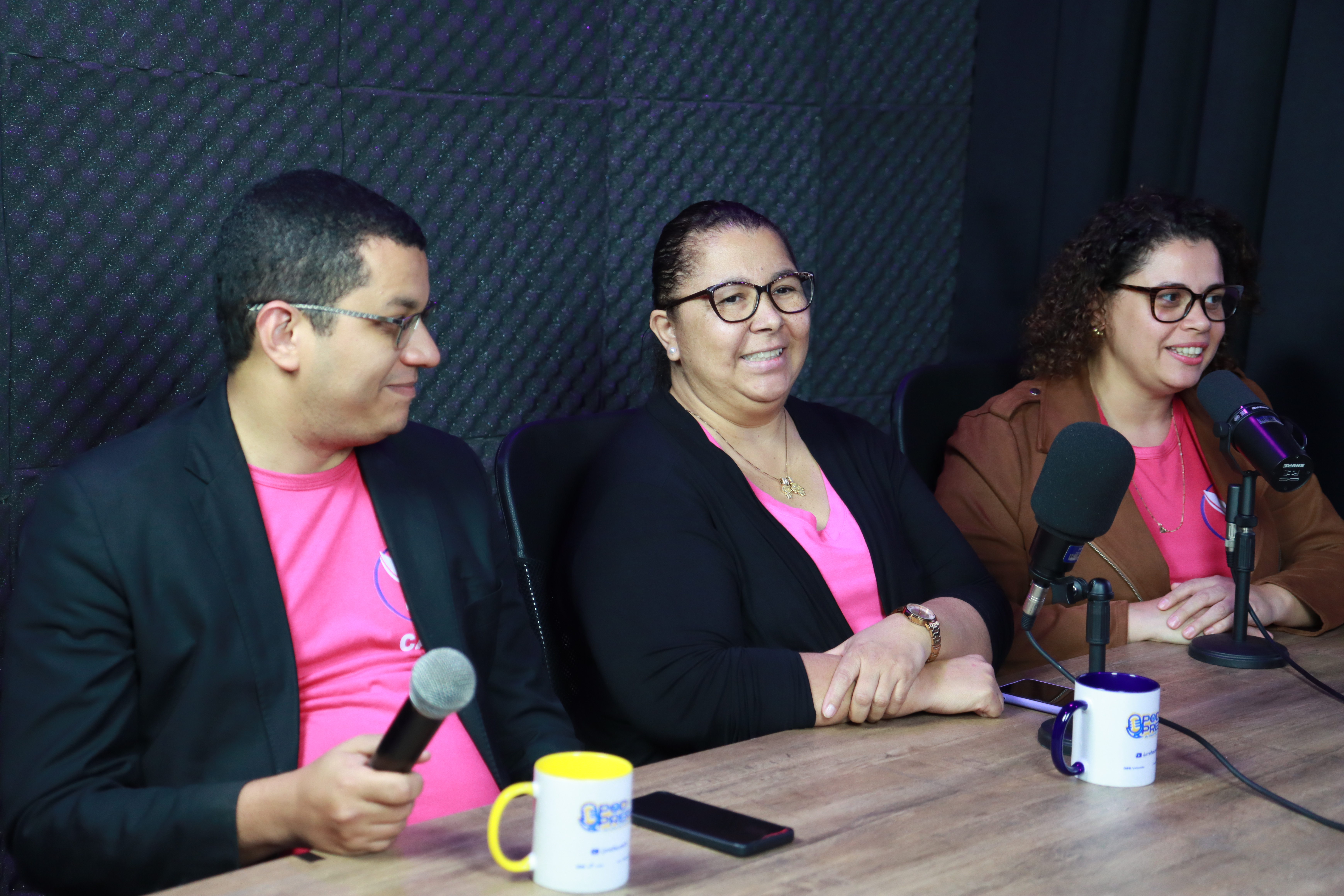 #PratodosVerem: Os convidados do 25º episódio do Pod da PrefSS, dedicado à campanha Outubro Rosa, aparecem sorrindo no estúdio durante a gravação. Eles vestem camisetas cor-de-rosa em referência à conscientização sobre o câncer de mama e seguram canecas personalizadas do programa. Sentados à mesa com microfones, demonstram descontração e sintonia enquanto participam da conversa sobre prevenção, diagnóstico e tratamento da doença. Fim da descrição.