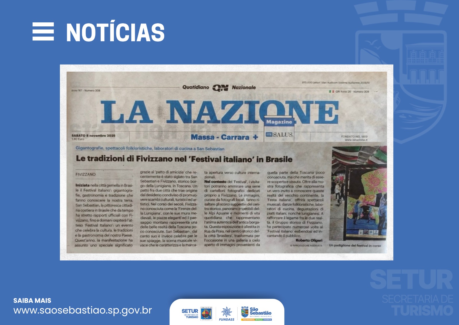 O Festival Italiano de São Sebastião ganhou destaque no jornal ‘La Nazione’, da Itália. O veículo de comunicação publicou uma reportagem que destaca as tradições culturais e enaltece a parceria entre o município de São Sebastião e Fivizzano, localizada na região da Toscana, cidades-irmãs unidas por um acordo de amizade e intercâmbio cultural.