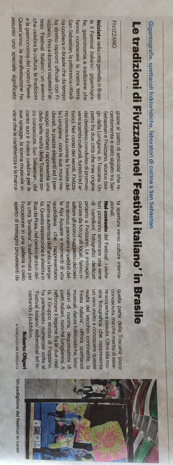 A matéria, intitulada ‘Le tradizioni di Fivizzano nel Festival italiano in Brasile’, destaca o sucesso do festival como uma importante vitrine das tradições italianas, com apresentações remetentes a Itália, culinária tradicional, entre outras atividades que retrataram as belezas e a história da Toscana.
