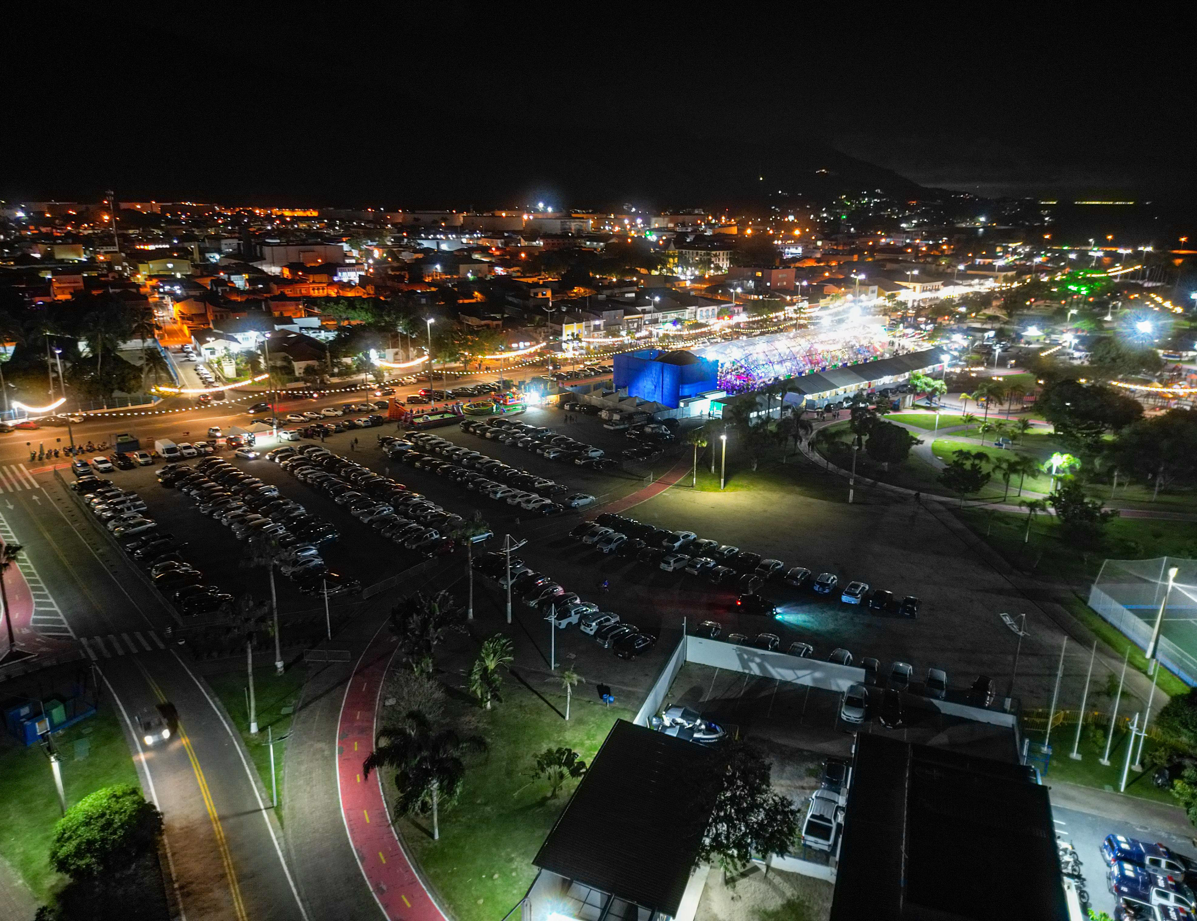 #PraTodosVerem: Imagens aéreas noturnas mostram uma grande área urbana iluminada. Em primeiro plano, há um amplo estacionamento repleto de carros organizados em filas, ladeado por ciclovia e vias bem iluminadas. Ao fundo, observa-se uma estrutura coberta por lona azul e um espaço com arquibancadas repletas de pessoas, com luzes coloridas indicando a realização de um evento festivo. Na segunda imagem, o mesmo local é visto de outro ângulo, revelando o mar refletindo as luzes da cidade ao fundo, além de áreas esportivas iluminadas e ruas com trânsito intenso e decoração luminosa, compondo uma cena vibrante e movimentada. Fim da descrição.