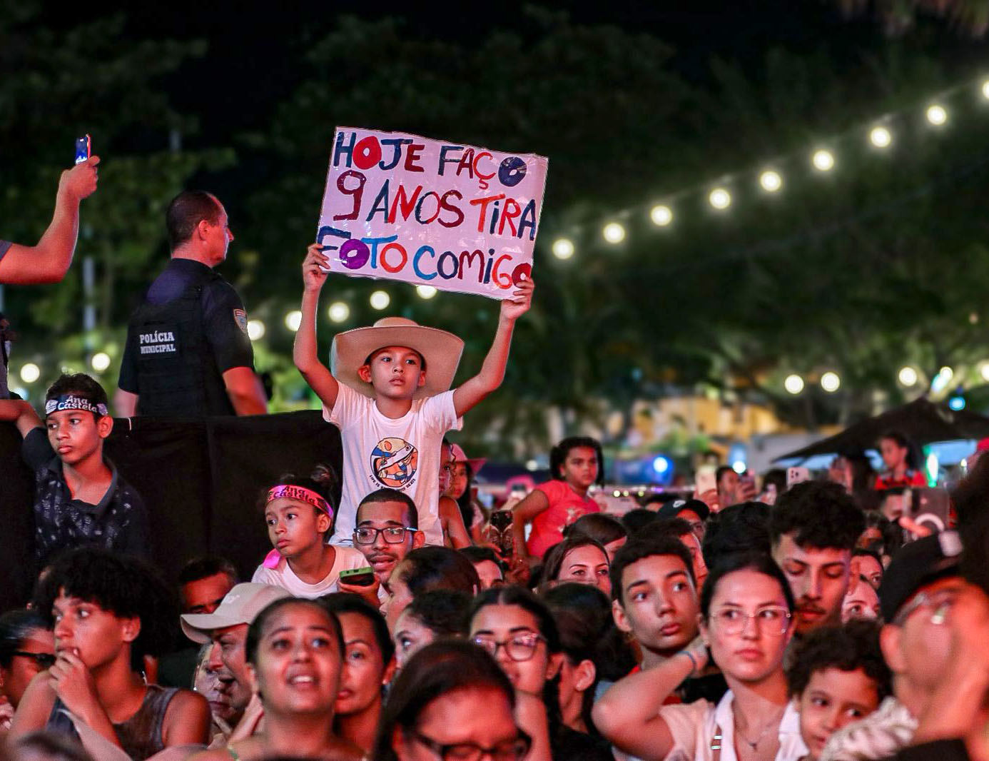 #PraTodosVerem: Multidão em um grande show ao ar livre, à noite. Pessoas de diferentes idades e tons de pele ocupam a frente do palco e o espaço do evento; muitas sorriem, cantam, aplaudem e filmam com celulares. Há iluminação intensa de palco, telões, estrutura metálica e efeitos de luz. Em destaque, público emocionado próximo à grade e, entre a multidão, uma criança erguida acima das pessoas segura um cartaz escrito à mão pedindo uma foto. O clima é de festa, alegria e grande participação popular. Fim da descrição.