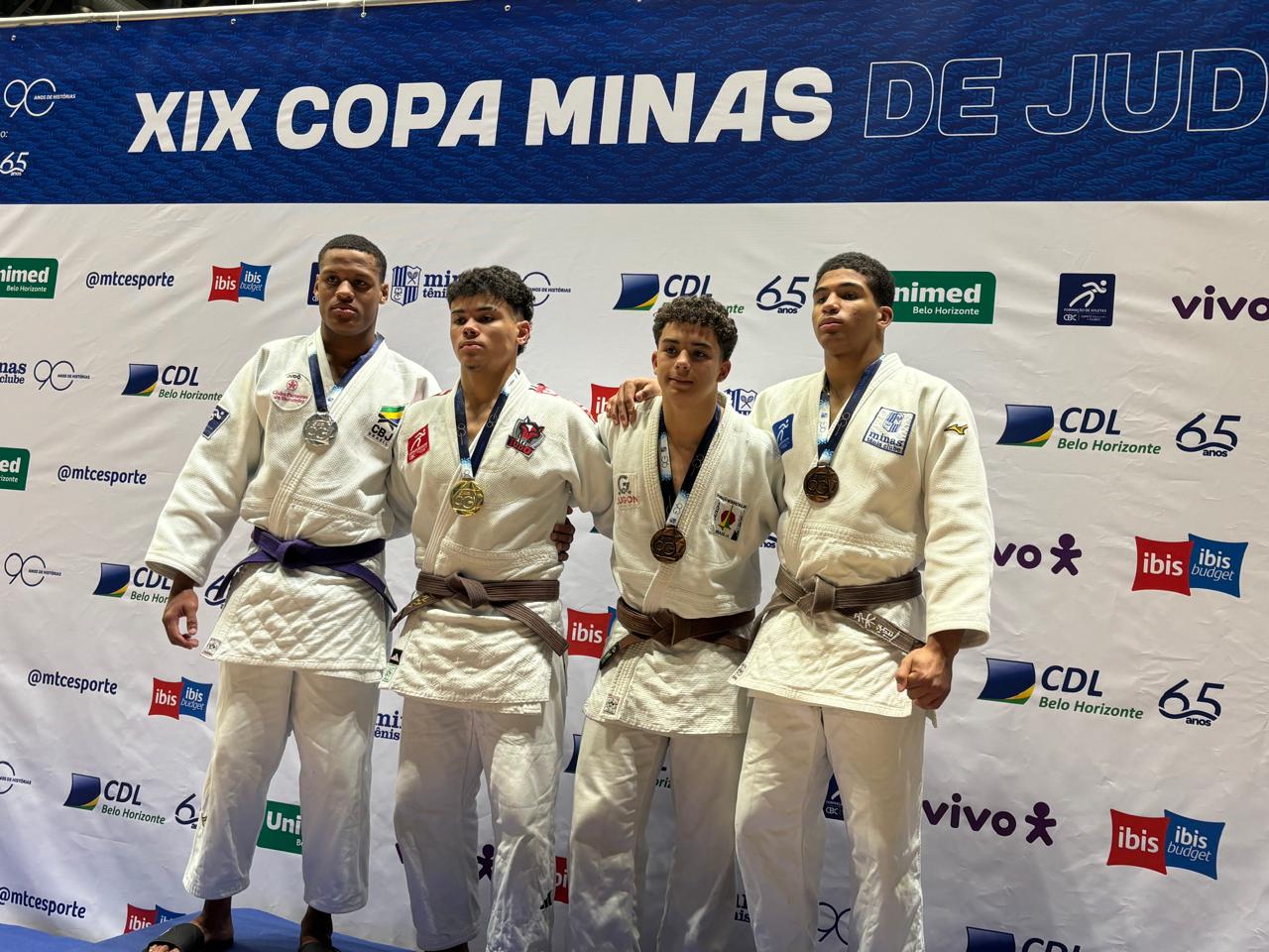 #PraTodosVerem: nas imagens, dois jovens atletas de judô comemoram sorridentes no tatame da XIX Copa Minas, com medalhas no peito e expressões de orgulho e alegria pela conquista. Um dos judocas aparece em destaque em diversas fotos, segurando sua medalha de ouro diante do painel oficial do evento e ao lado dos demais medalhistas do pódio. Em outra cena, o judoca Pedro caminha concentrado com seu quimono azul e faixa marrom, representando a equipe do SESI-SP, em meio ao ambiente competitivo do ginásio. Fim da descrição.
