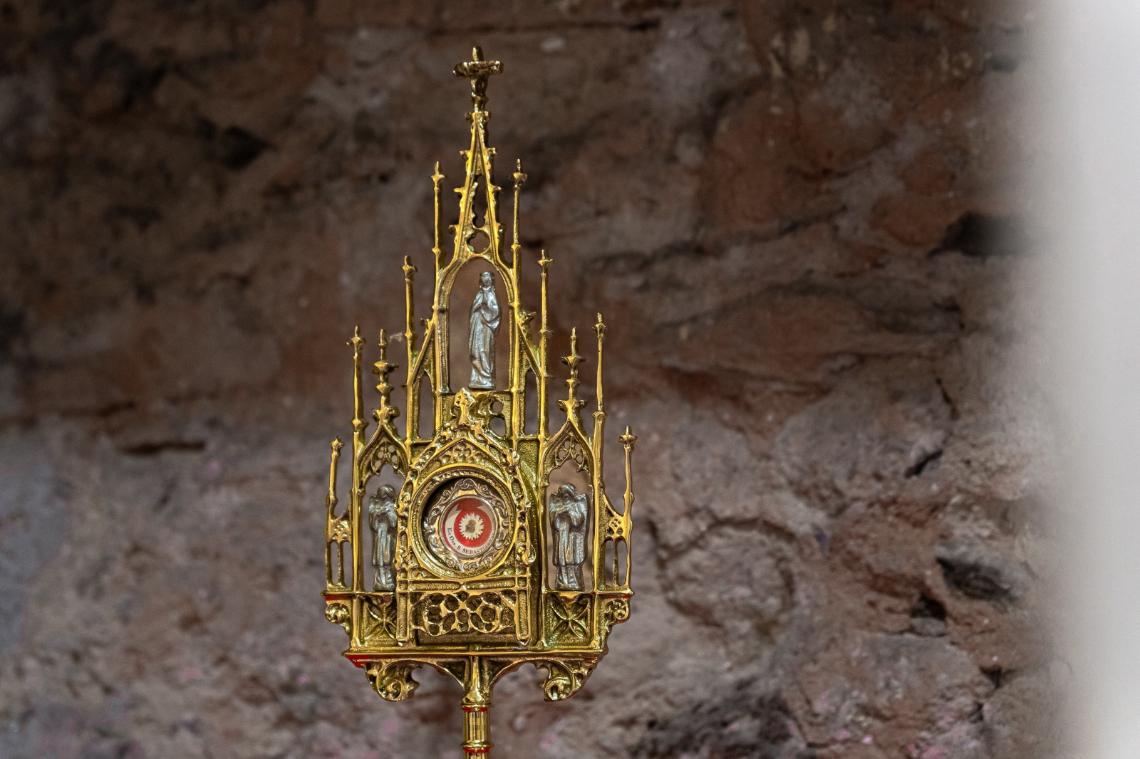 #PraTodosVerem: imagens da relíquia de primeiro grau de São Sebastião, uma parte do corpo do próprio mártir, no interior da Paróquia de São Sebastião. Fim da descrição.