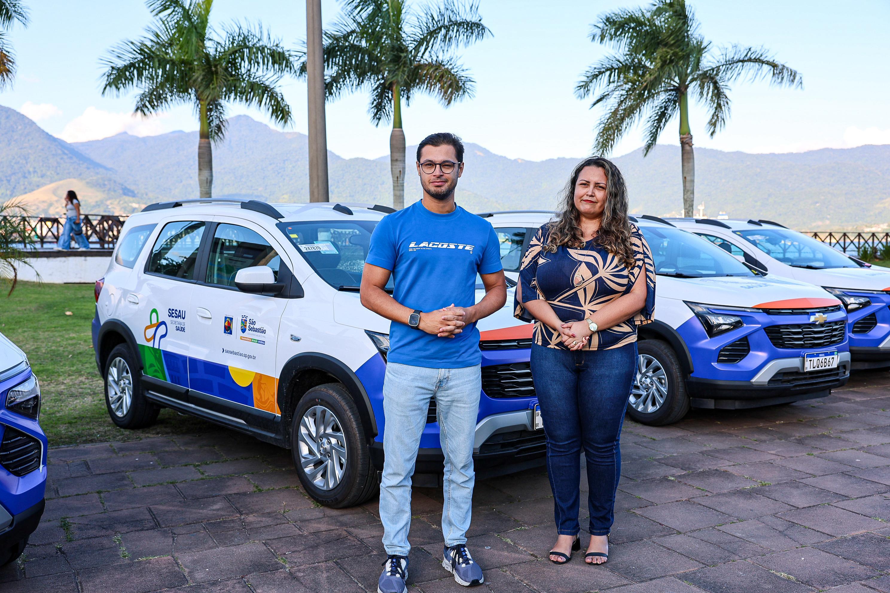 #PraTodosVerem: quatro fotos mostram a entrega de novos carros brancos, modelo SUV da Chevrolet, adesivados com logotipos coloridos da Prefeitura de São Sebastião e da Secretaria de Saúde (Sesau). Os veículos estão estacionados em um calçadão à beira-mar, com palmeiras e montanhas ao fundo. Em algumas imagens, pessoas posam ao lado dos carros ou conversam. Uma das fotos mostra um homem acenando de dentro do veículo com sinal de positivo. O dia está ensolarado, com céu azul e algumas nuvens. Fim da descrição.