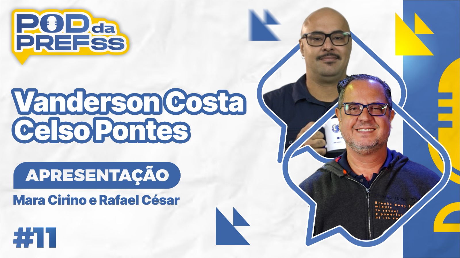 #PraTodosVerem: arte institucional com fotos do pintor letrista Celso Pontes e do grafiteiro Vanderson Costa, o Biro, convidados do 11º episódio da 3ª temporada do Pod da Prefss. Além disso, tem fotos dos apresentadores Rafael César e Mara Cirino, apresentando o programa. Fim da descrição.