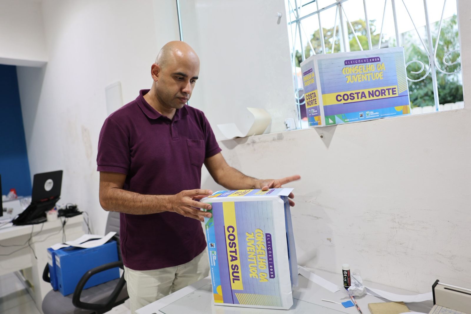#PraTodosVerem: Sequência de fotos registradas em ambiente interno, mostrando o preparo de urnas para as eleições do Conselho Municipal da Juventude 2025, em São Sebastião. Em destaque, uma urna retangular decorada com cores azul, amarela e roxa. Na parte frontal da urna, os dizeres: "ELEIÇÕES 2025 - CONSELHO DA JUVENTUDE - COSTA NORTE". Abaixo, os logotipos da Prefeitura de São Sebastião e suas redes sociais. Na próxima, homem de pele clara e cabeça raspada, vestindo camiseta polo vinho e calça bege, está inclinado sobre uma mesa, dobrando papéis ao lado de outra urna com os mesmos dizeres. No fundo, a urna da Costa Norte aparece novamente apoiada sobre o parapeito de uma janela. Já na última, homem segura uma urna com a inscrição "COSTA SUL", também decorada nas cores azul, amarela e roxa, enquanto faz o acabamento com papéis adesivos. Sobre a mesa, há materiais de montagem como cola, tesoura, régua e papéis. Fim da descrição.