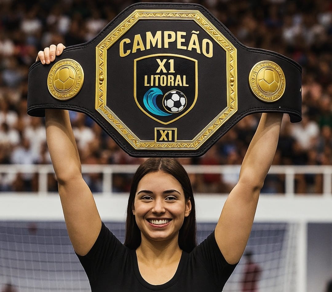 #PraTodosVerem: as imagens destacam a atmosfera vibrante e competitiva do X1 Litoral: a primeira mostra o cartaz oficial do evento com dois jogadores disputando a bola sob refletores intensos, ao fundo de uma quadra iluminada e cercada por arquibancadas; a segunda registra uma arena lotada, com iluminação cênica em verde e laranja, evidenciando a grandiosidade do espetáculo; a terceira exibe dois atletas sorridentes exibindo um grande cinturão dourado de campeões após a vitória; na última imagem, uma mulher segura o cinturão do X1 Litoral acima da cabeça, sorrindo, com o público ao fundo, simbolizando o prestígio e a consagração do evento. Fim da descrição.