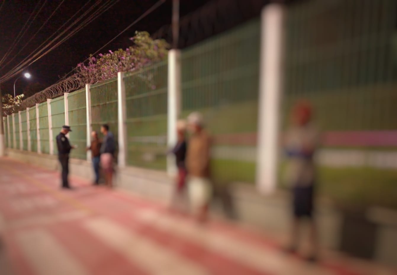 #PraTodosVerem: Durante uma ação noturna, agentes da Polícia Municipal de São Sebastião realizam a abordagem de pessoas em uma calçada próxima, cercada por grades e arame farpado; em seguida, um policial abre a parte traseira de uma viatura adaptada com compartimentos para transporte seguro e, por fim, conduz um homem, até o interior do veículo. Fim da descrição.