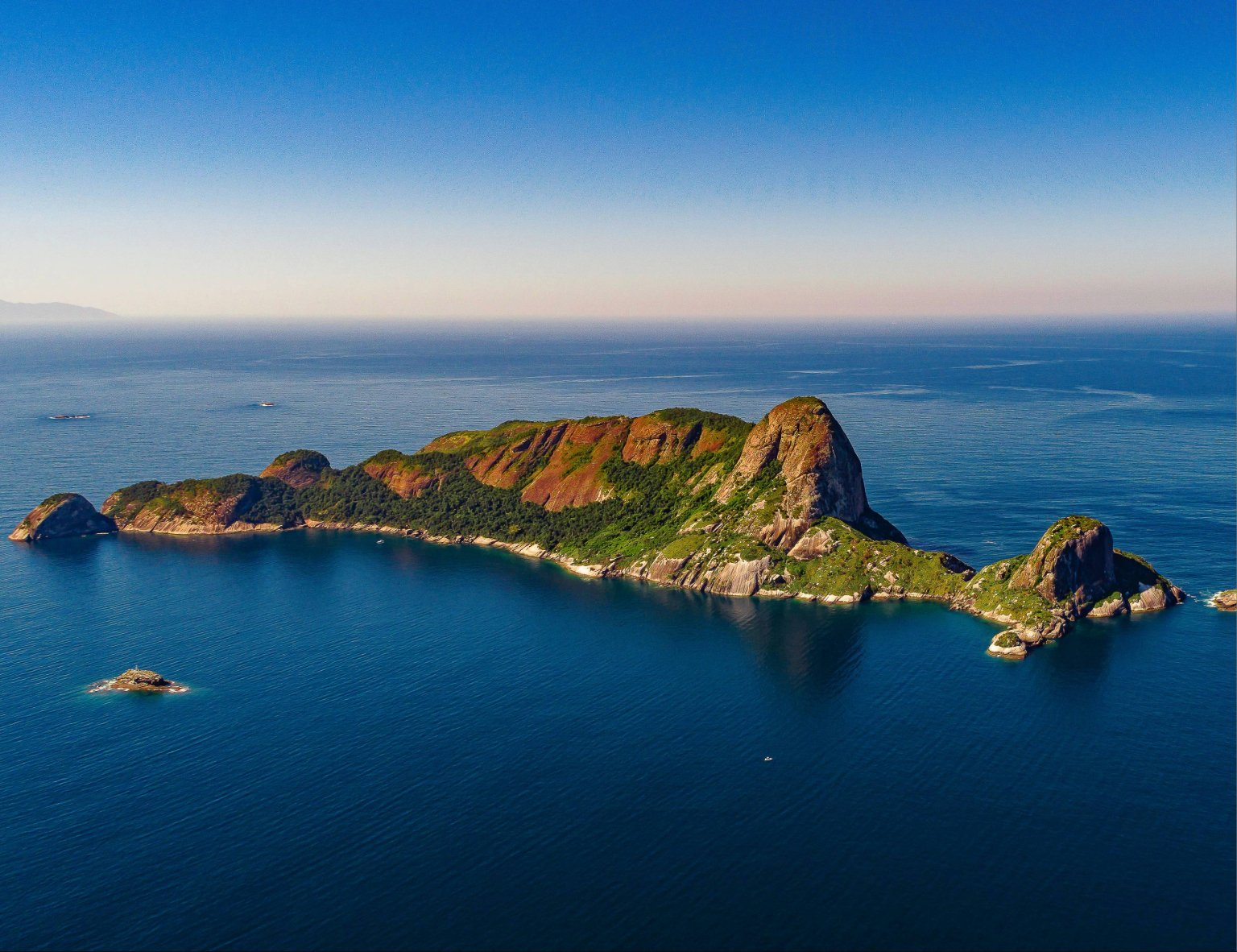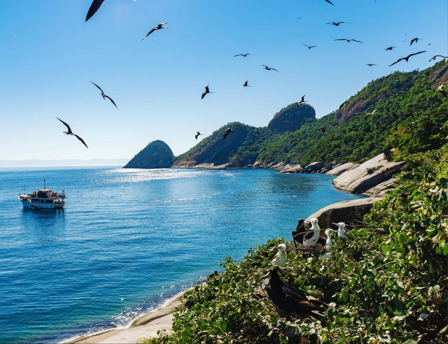 #PraTodosVerem: Três imagens do Arquipélago de Alcatrazes, em São Sebastião. A primeira mostra um barco no mar azul, aves sobrevoando e outras pousadas entre a vegetação. A segunda mostra uma baleia próxima a um barco, sendo observada e fotografada por pessoas. A terceira é uma vista aérea do Arquipélago de Alcatrazes cercadas pelo mar azul intenso e céu claro. Fim da descrição.