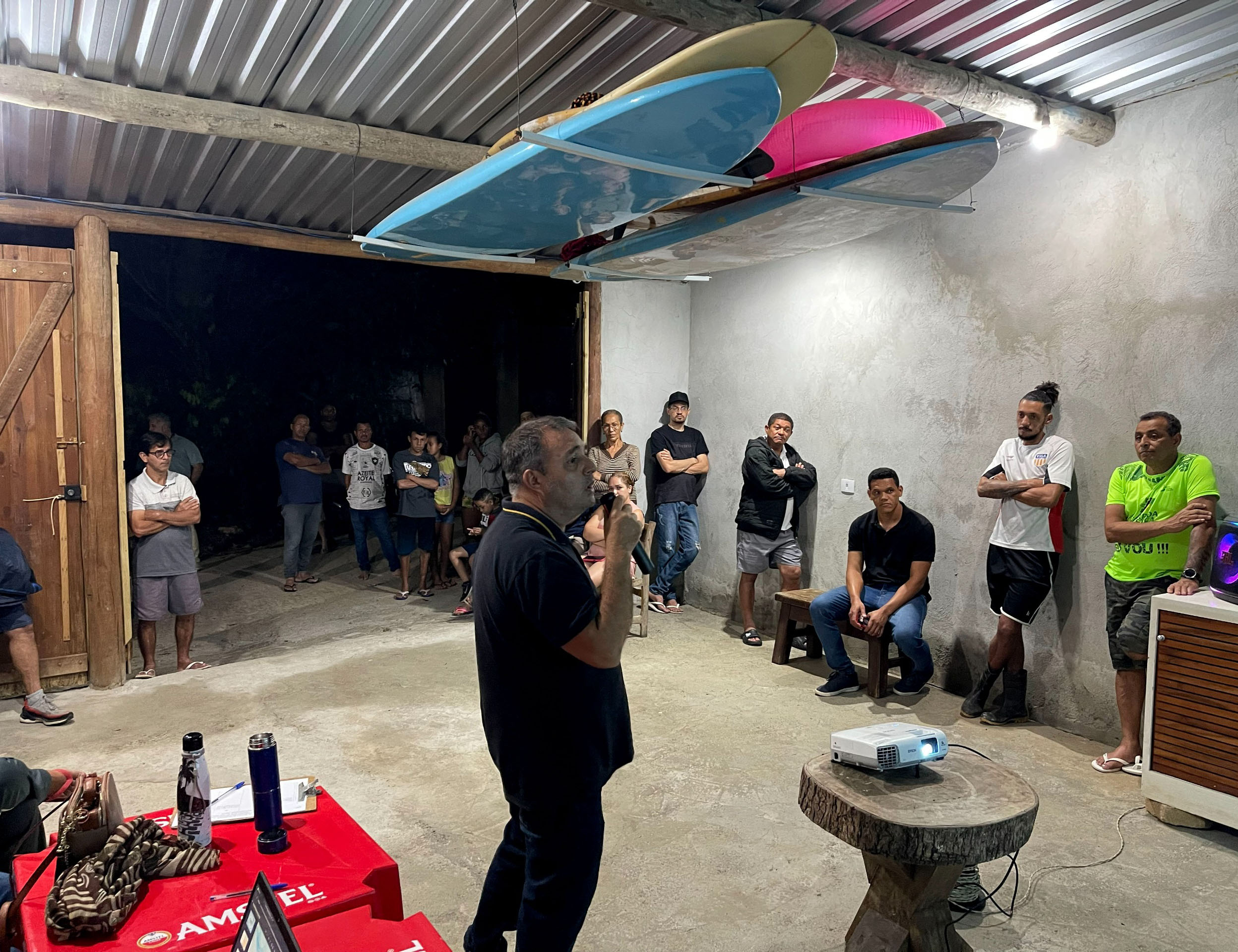 #PraTodosVerem: As imagens mostram uma reunião comunitária realizada em um espaço coberto com paredes de cimento e portas de madeira abertas. Um grupo de pessoas, em pé e sentadas, assiste a uma apresentação projetada em uma tela branca. O palestrante, de camiseta escura, fala com microfone em frente a um projetor apoiado em uma mesa de madeira. No ambiente há pranchas de surfe penduradas no teto, cadeiras vermelhas e mesas com notebook e garrafas. A plateia, composta por homens e mulheres de diferentes idades, acompanha atentamente a fala, em clima de atenção e diálogo coletivo. Fim da descrição.