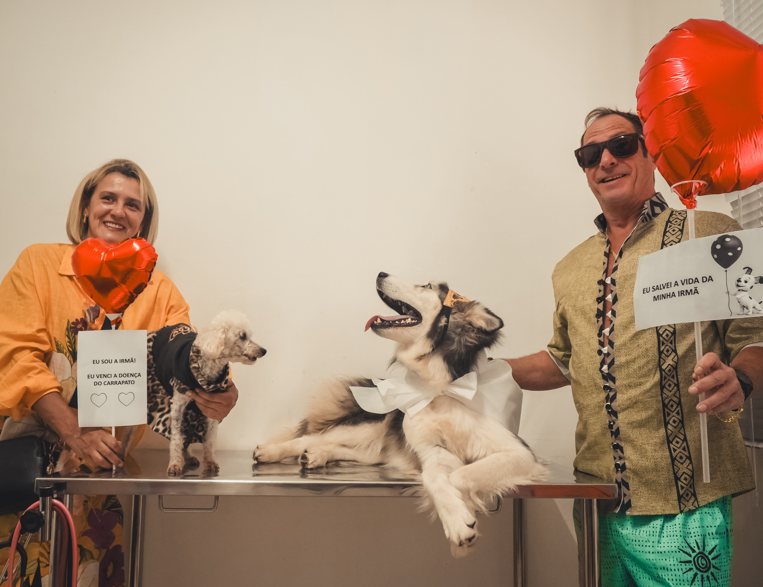 Nesta sexta-feira (14/11), as irmãs caninas Sophie, da raça Poodle, com aproximadamente 15 anos, e Kiara, uma Husky Siberiana com Malamute do Alaska, de 2, foram receber seus certificados e o carinho da equipe humana do PATA, que acompanhou a luta pela vida dos dois cães.