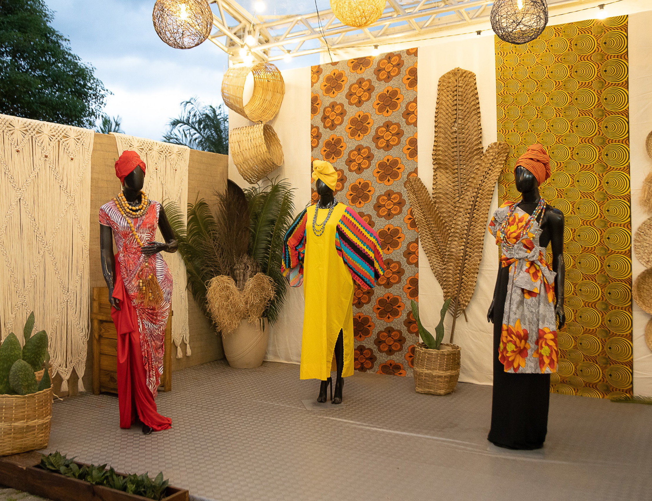 #PraTodosVerem: As imagens documentam um festival cultural com foco em música, arte e culinária afro-brasileira, realizado em um palco e iluminação. A primeira foto mostra a plateia animada assistindo a uma banda no palco. A segunda exibe manequins com trajes africanos e peças artesanais em um estande decorado. A terceira foto é um close-up de três cantores, duas mulheres e um homem com chapéu, sorrindo e cantando no palco. A quarta imagem mostra um prato de acarajé, com camarões e vinagrete, sobre uma folha de bananeira. Fim da descrição.