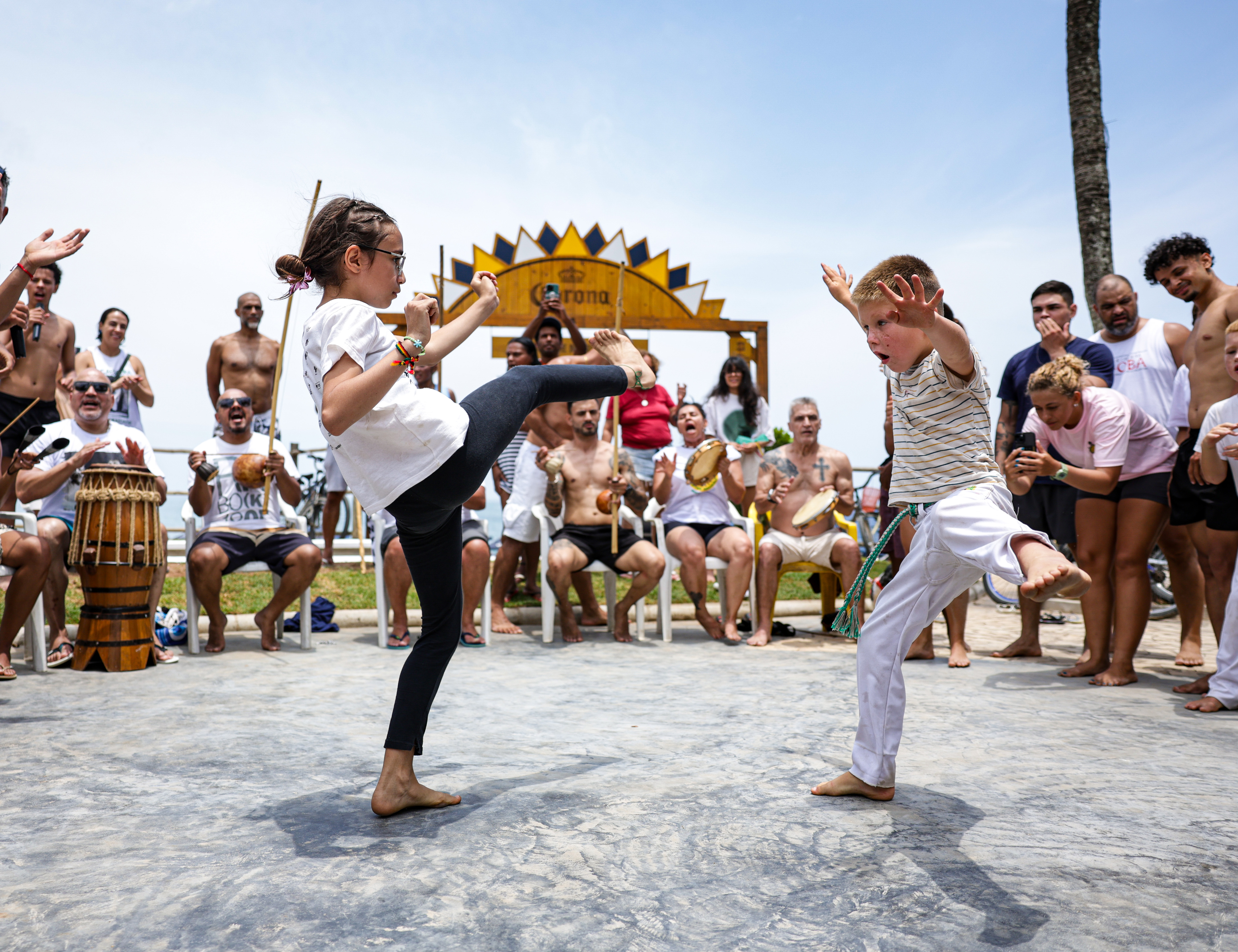 #PraTodosVerem: Quatro imagens em sequência. A primeira mostra um grande evento noturno com muitas pessoas sentadas em mesas de madeira em uma área coberta e iluminada, com uma estrutura de palco decorada em verde e vermelho ao centro. A segunda é uma vista aérea noturna de um palco à beira-mar com a marca "SS Sambinha", rodeado por uma grande multidão e barracas, com a rua e a orla marítima iluminadas ao fundo. A terceira foto, sob o sol forte, captura um momento de capoeira onde duas crianças, um menino e uma menina, realizam movimentos em frente a um grupo de adultos que toca instrumentos e assiste. A quarta e última imagem mostra um grupo de sete meninos, vestindo uniformes de futebol de praia vibrantes em tons de amarelo, verde e vermelho, posando na areia da praia em frente a uma trave de futebol e uma rede de proteção amarela. Fim da descrição.