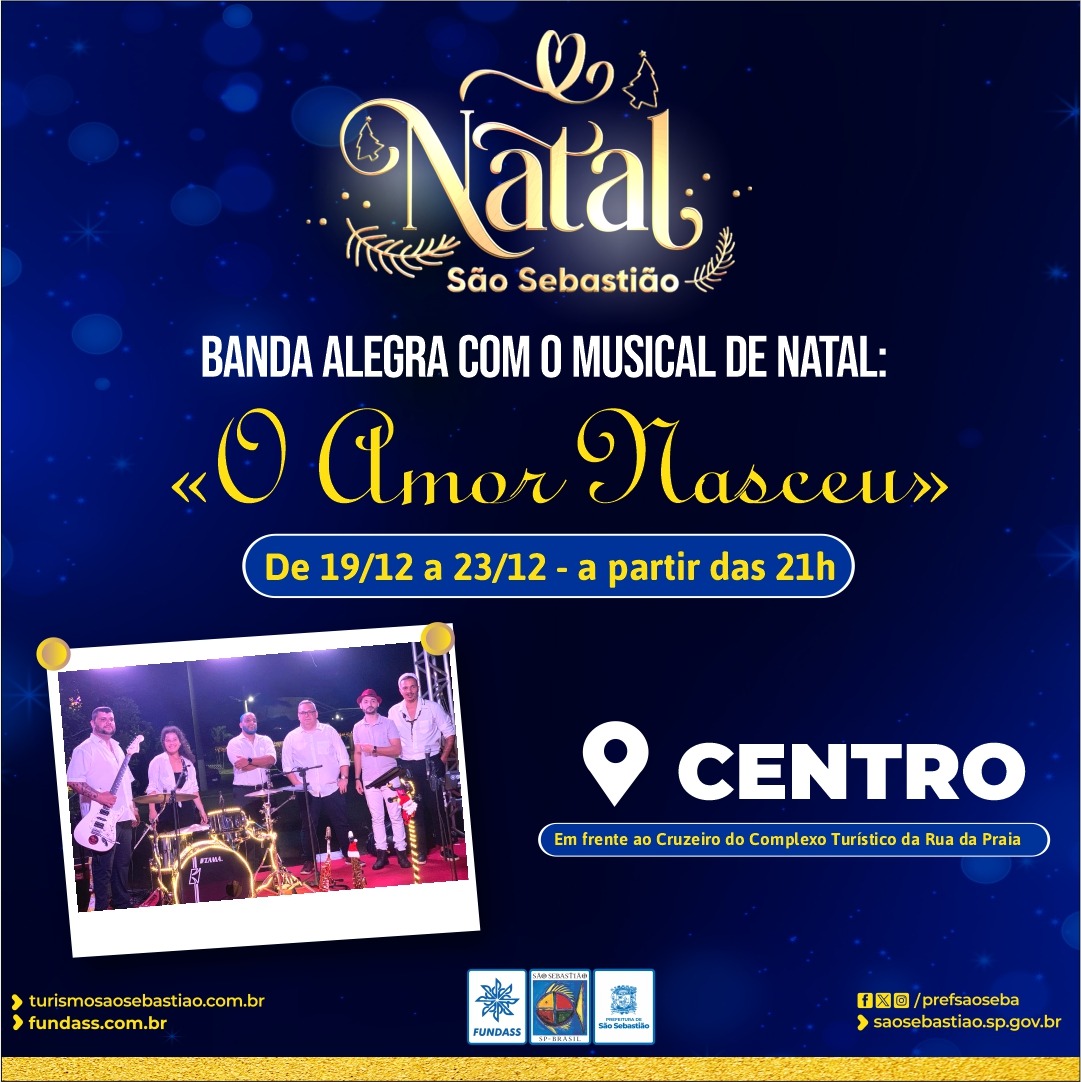 De 19 a 23 de dezembro, a Banda Alegra apresentará o espetáculo musical ‘O Amor Nasceu’, sempre às 21h, em frente ao Cruzeiro do Complexo Turístico da Rua da Praia. Com duração de 120 minutos, o show contará com 39 músicas nacionais, internacionais e instrumentais, incluindo solos de saxofone. O repertório foi cuidadosamente selecionado para transmitir mensagens de amor, paz, esperança e celebrar o nascimento do Menino Jesus.