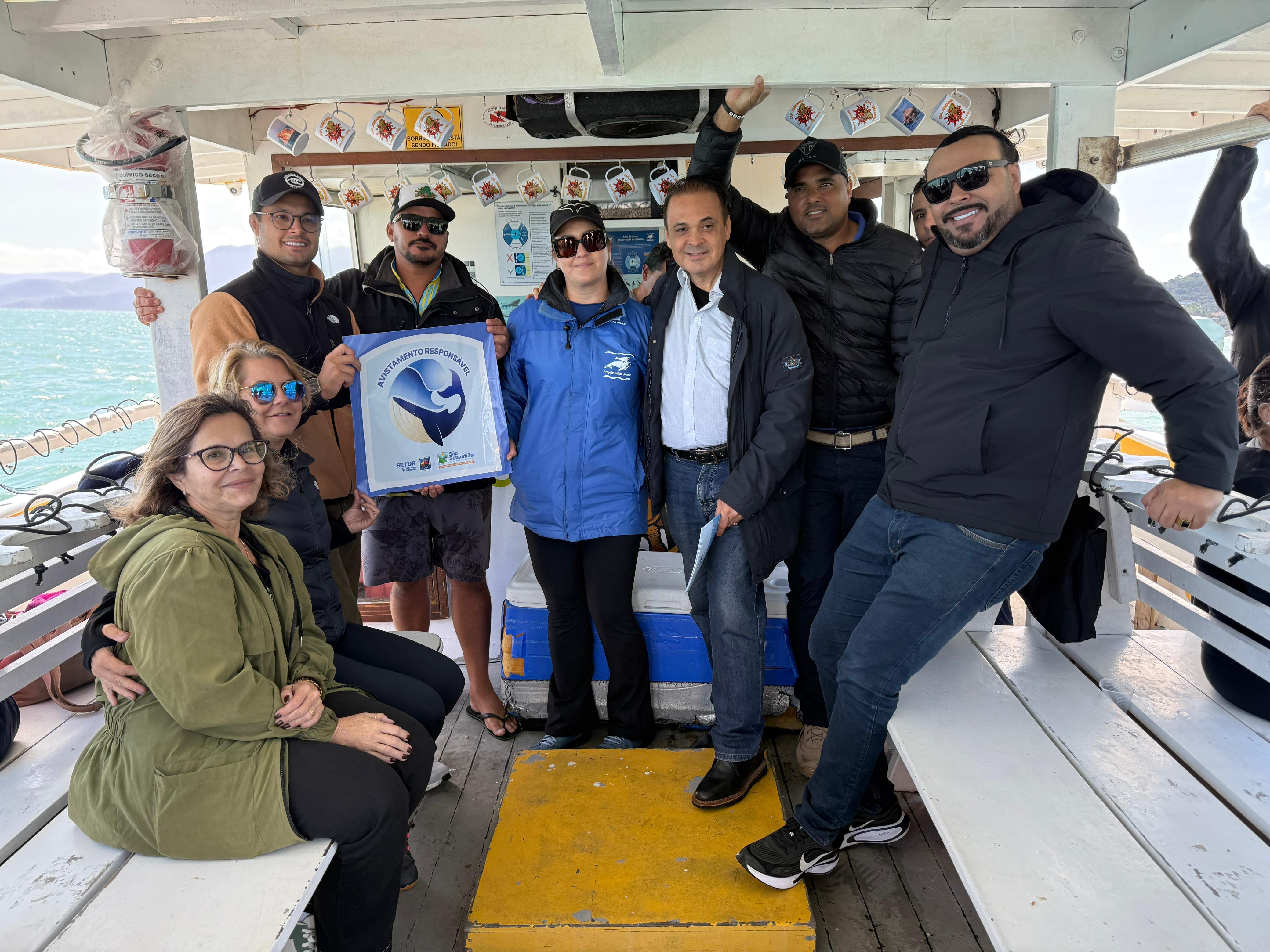 Na última sexta-feira (13/6), durante o passeio de avistamento de baleias-jubarte no Canal de São Sebastião - que contou com a presença do secretário de Turismo do Estado de São Paulo, Roberto de Lucena, do prefeito de São Sebastião, Reinaldinho Moreira, e da coordenadora do Projeto Baleia Jubarte, Rafaela Souza - a embarcação Capitão Ximango, uma das participantes da oficina, recebeu o selo por realizar o passeio de forma segura e alinhada às boas práticas ambientais.