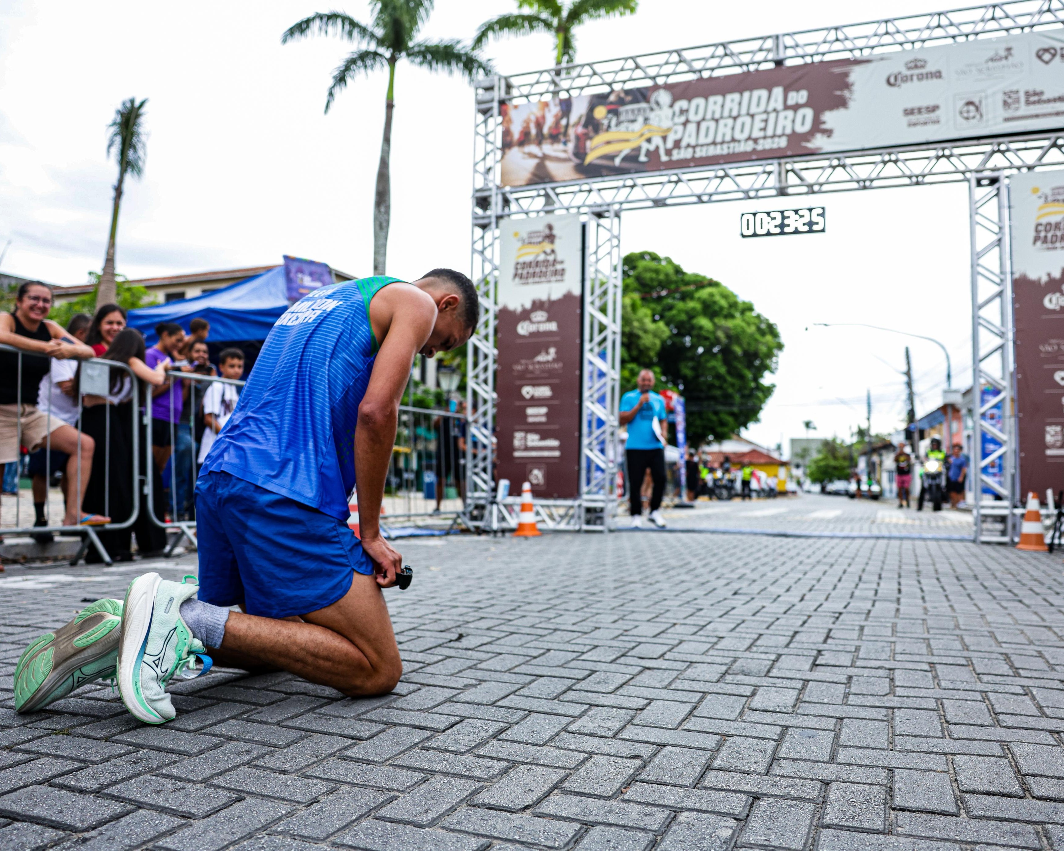 #PraTodosVerem: Atletas de diferentes idades e perfis participam da Corrida do Padroeiro, em São Sebastião, reunindo dezenas de corredores no centro histórico da cidade, com largada em frente à igreja matriz, decorada para a celebração do padroeiro; as imagens mostram o início da prova com o pelotão avançando pelas ruas de paralelepípedo, a passagem dos corredores sob o pórtico oficial do evento, marcado por cronômetro e estrutura metálica, além do envolvimento do público que acompanha e incentiva ao longo do percurso. Fim da descrição.