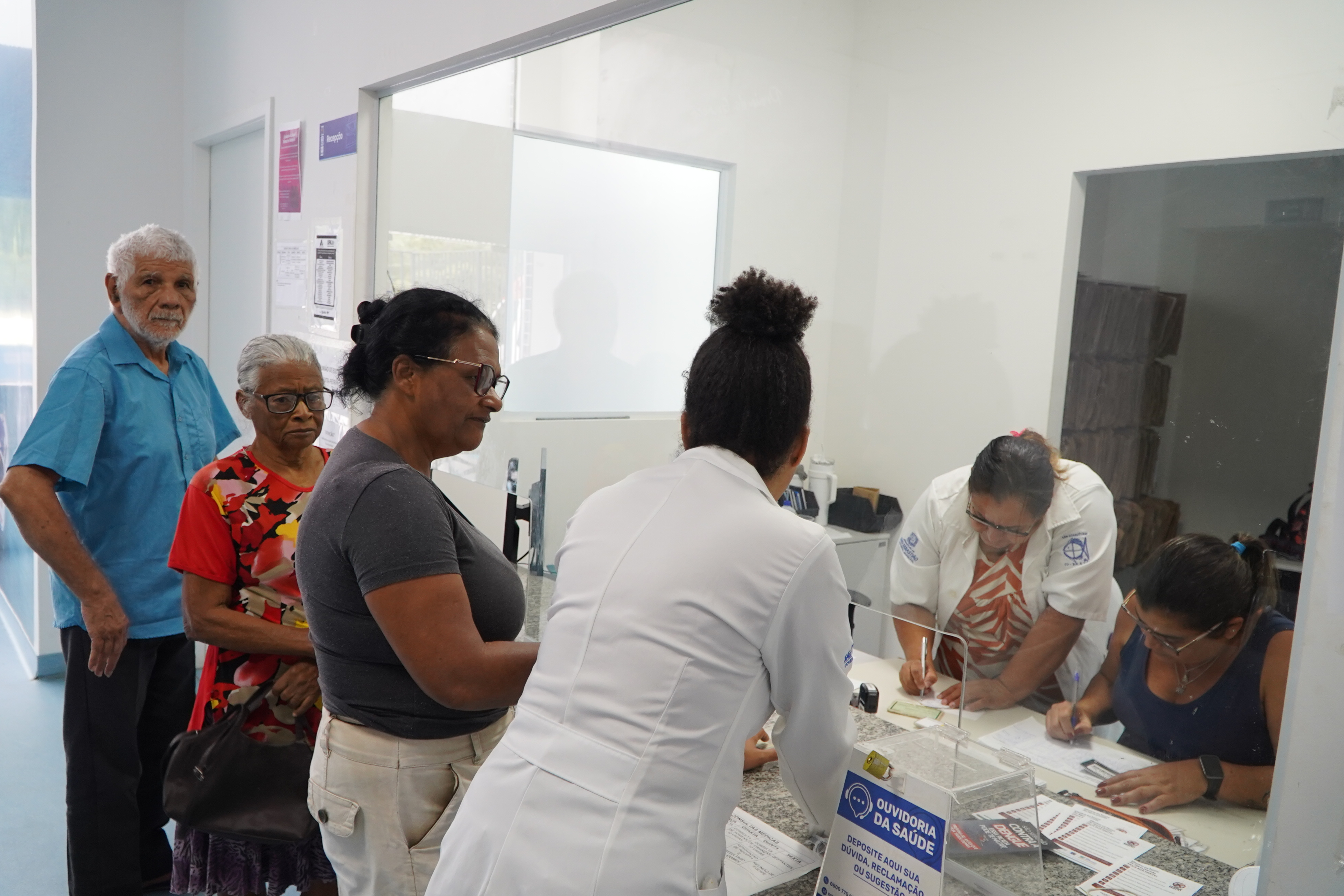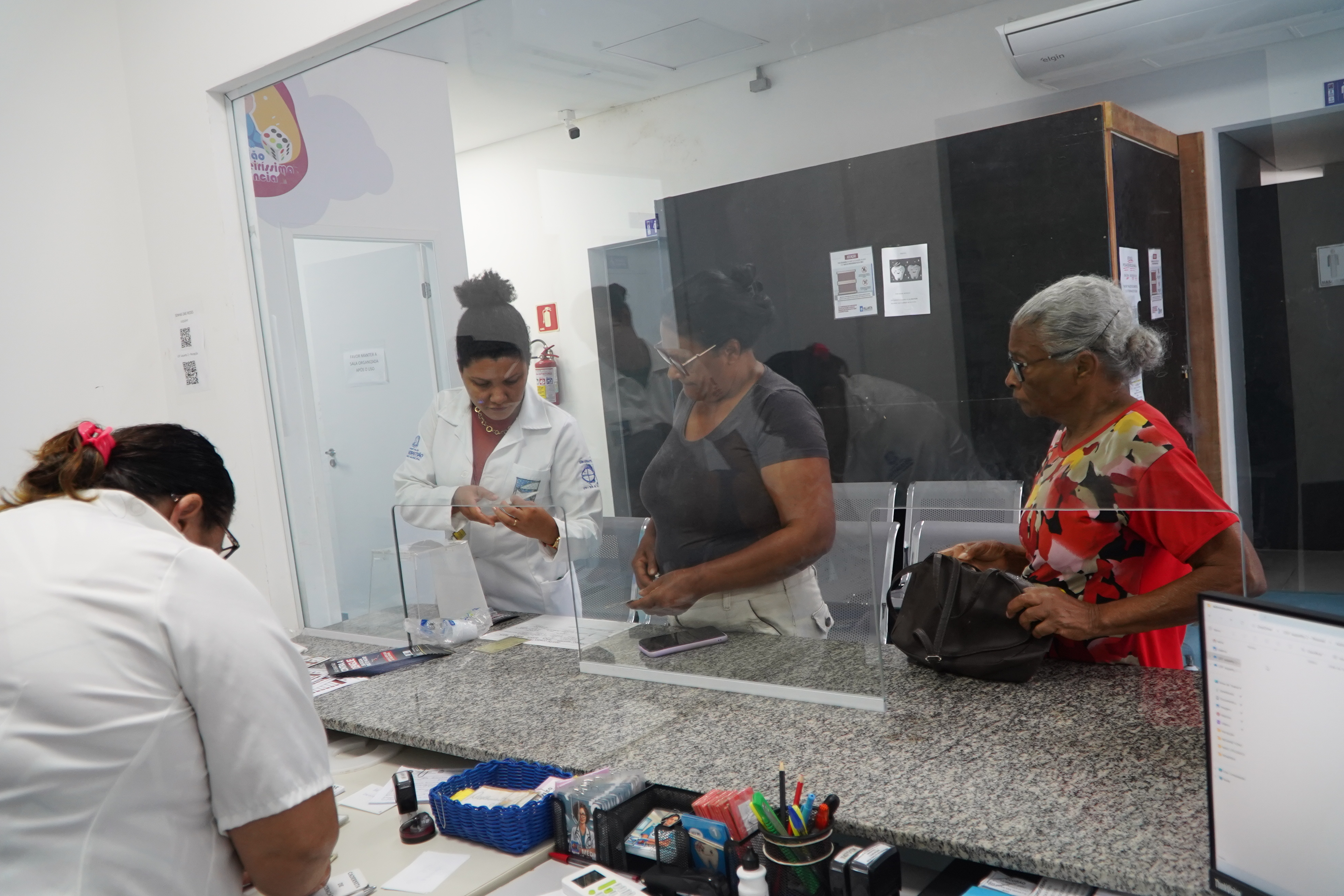 #PraTodosVerem: as imagens retratam um ambiente de atendimento à saúde, possivelmente uma clínica ou posto de saúde. Em uma das fotos, vemos pessoas em um balcão de atendimento com divisória de vidro. Uma funcionária de jaleco branco atende duas mulheres, uma delas procurando algo em sua bolsa. Na outra foto, mais pessoas estão aguardando ou sendo atendidas; há um homem idoso e duas mulheres em fila, enquanto outras duas funcionárias trabalham em um balcão. Uma placa da "Ouvidoria da Saúde" é visível. O ambiente é claro e parece organizado. Fim da descrição.