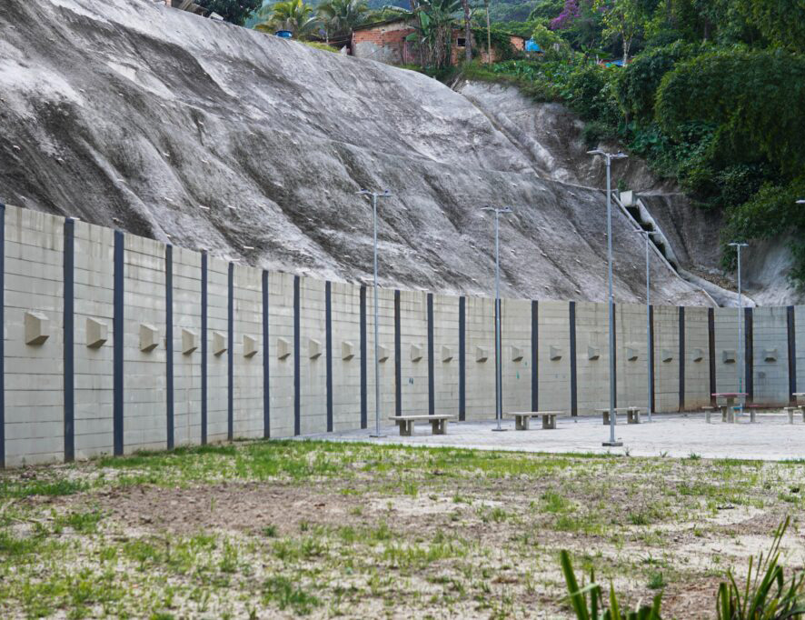 Nas localidades de Vila Paraíso, Vila Progresso e Vila Pantanal, a engenharia adotou solução mista de alta performance para estabilização das encostas. Na parte superior dos taludes, foi aplicada a técnica de solo grampeado, que utiliza barras de aço passivas para reforçar o maciço. Na base das encostas, onde a carga de empuxo é maior, foram construídos muros de placas de concreto com tirantes. Diferentemente dos grampos, os tirantes são elementos ativos que recebem carga de protensão, garantindo ancoragem profunda e rígida para sustentar o pé do talude. O sistema foi complementado com canaletas e escadas hidráulicas, responsáveis por reduzir a energia da água e evitar processos erosivos.