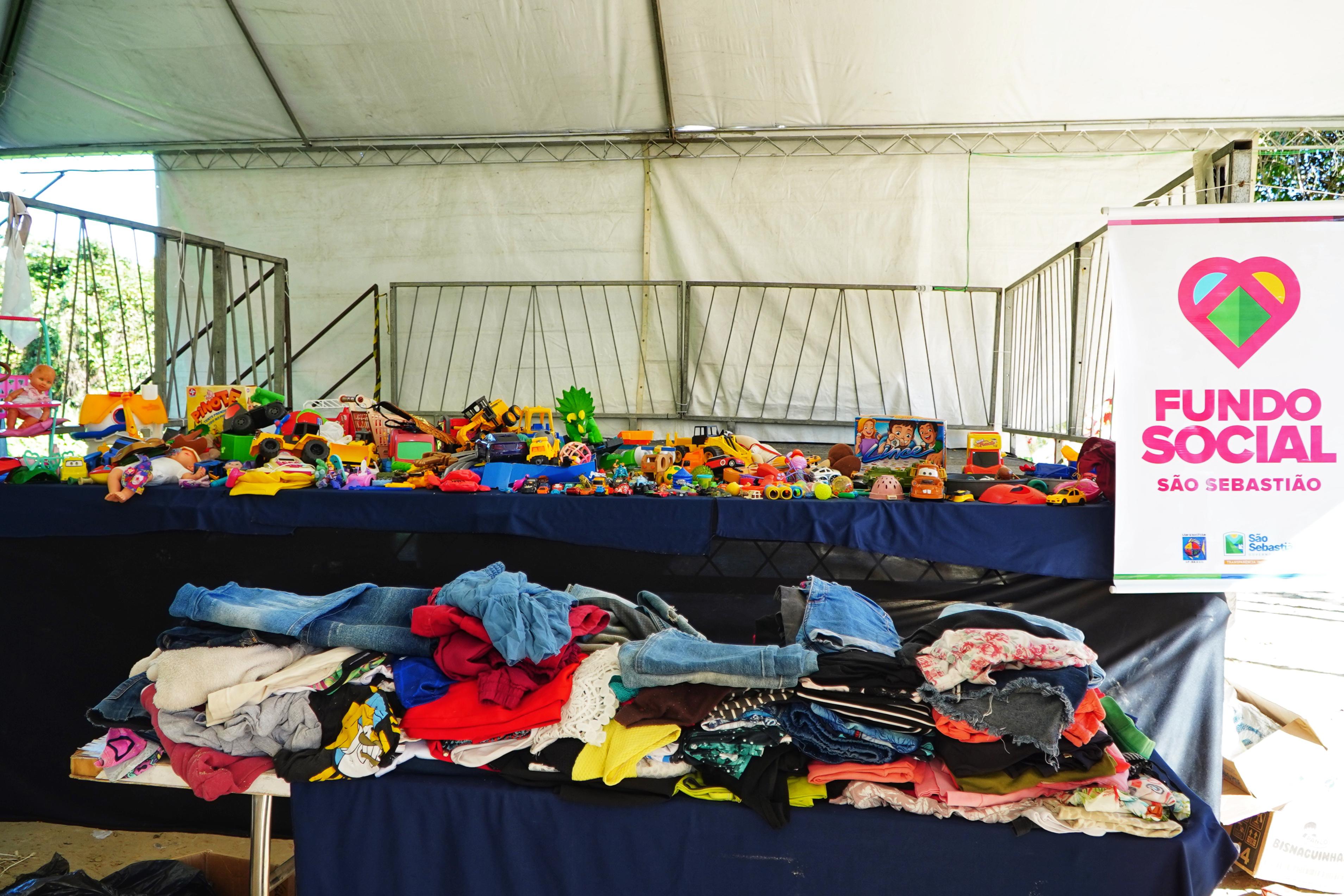 #ParaTodosVerem: Imagem 1: Sob uma tenda branca, várias mulheres estão de costas, escolhendo roupas em um varal com cabides. Elas olham atentamente as peças disponíveis, com destaque para uma mulher de chapéu de palha e outra com uma blusa verde estampada. Ao fundo, há uma placa com o logotipo do Fundo Social de São Sebastião. Imagem 2: Exposição organizada de brinquedos e roupas sob uma tenda. A parte superior da mesa está repleta de brinquedos coloridos, como bonecas, carrinhos e jogos. Na parte inferior, pilhas de roupas dobradas em diversas cores. À direita da imagem, há uma placa com o logotipo do Fundo Social de São Sebastião. Imagem 3: Seis pessoas estão alinhadas atrás de uma mesa coberta com roupas dobradas, sob uma tenda. Todos vestem camisetas rosa do Fundo Social, com exceção de um homem com camiseta azul escura. À esquerda e à direita da imagem, banners do Fundo Social de São Sebastião. Um cachorro preto está deitado no chão, parcialmente visível sob a mesa à frente. Fim da descrição.