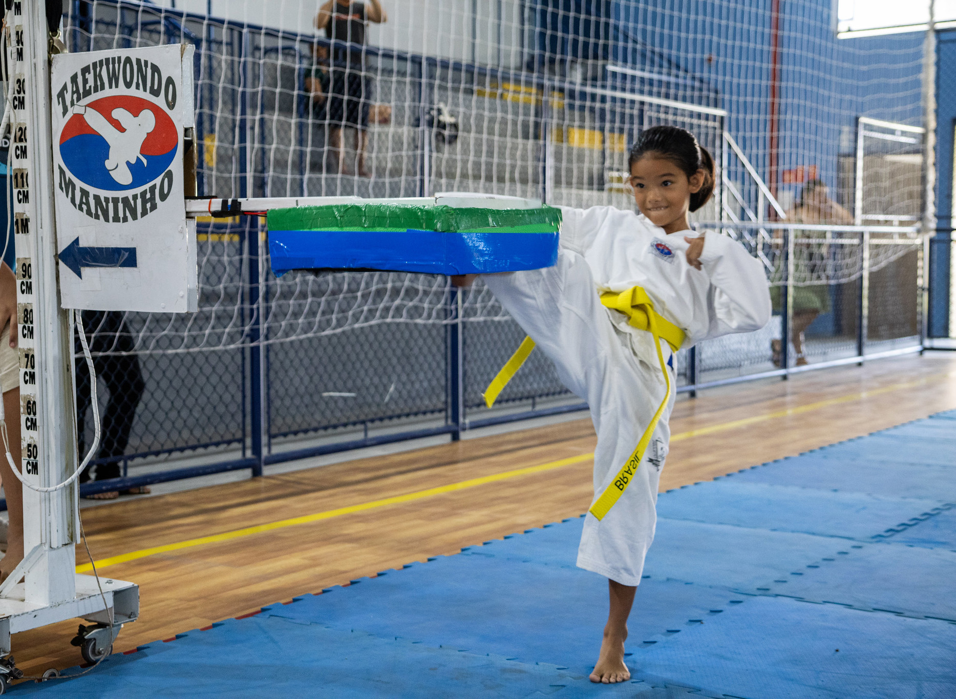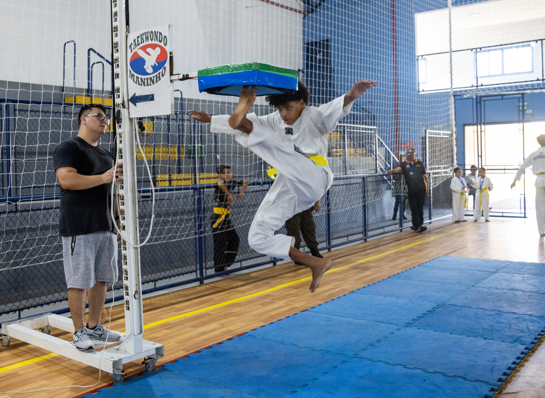 #PraTodosVerem: As imagens retratam atividades esportivas em um ginásio coberto, com público nas arquibancadas ao fundo. A primeira foto mostra uma mulher, com faixa preta de judô, entregando faixas azuis para uma fila de crianças vestindo quimonos brancos, indicando uma cerimônia de graduação ou premiação de judô. A segunda imagem foca em um jovem em um quimono branco com faixa amarela, realizando um salto sobre uma barra em uma pista azul, demonstrando uma técnica de Taekwondo, com um adulto observando ao lado. Fim da descrição.