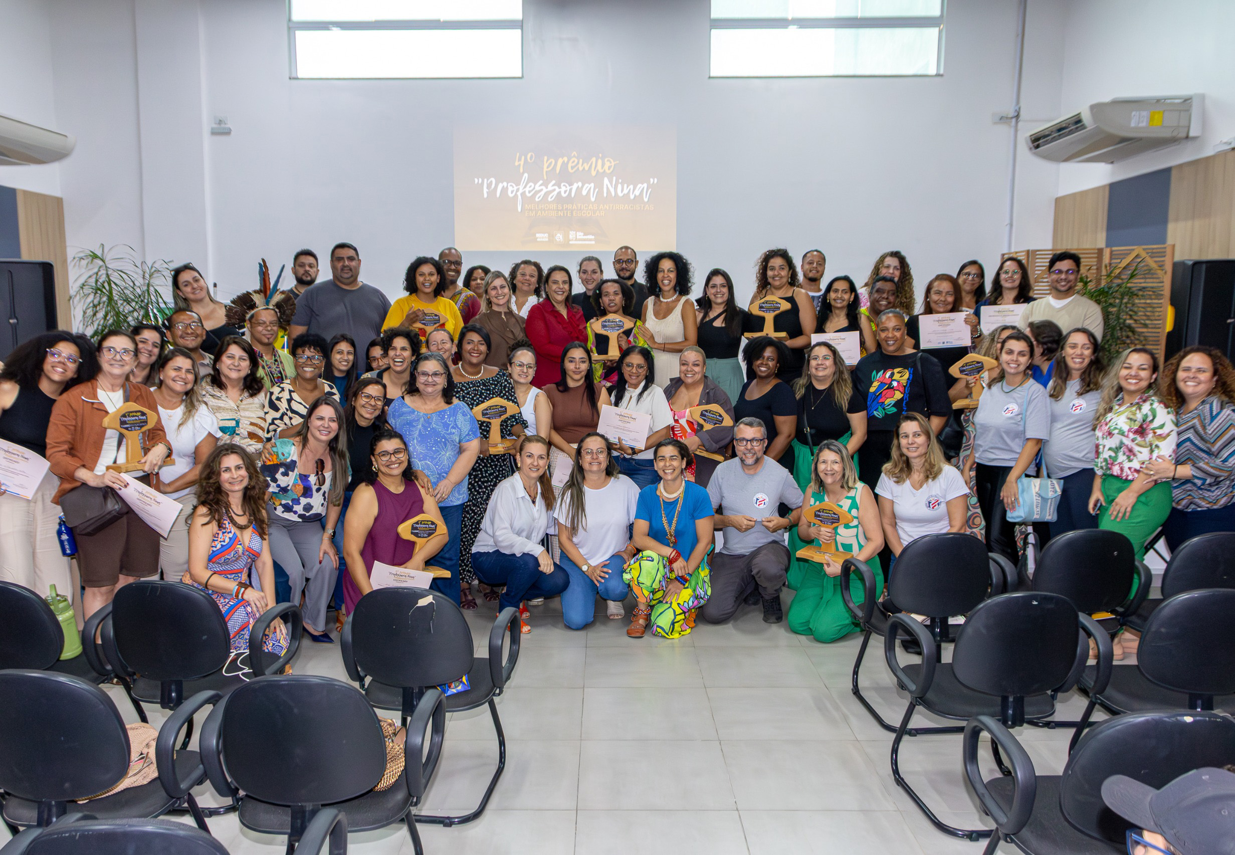 #PraTodosVerem: As fotos registram a cerimônia do 4º Prêmio “Professora Nina”, que reconhece práticas antirracistas nas escolas. Um grande grupo de educadores posa junto para a foto oficial, segurando certificados e troféus em formato de árvore. Há também imagens dos troféus sobre a mesa, uma apresentação de dança no palco e a entrega dos prêmios aos vencedores, com participantes sorrindo e celebrando. Fim da descrição.