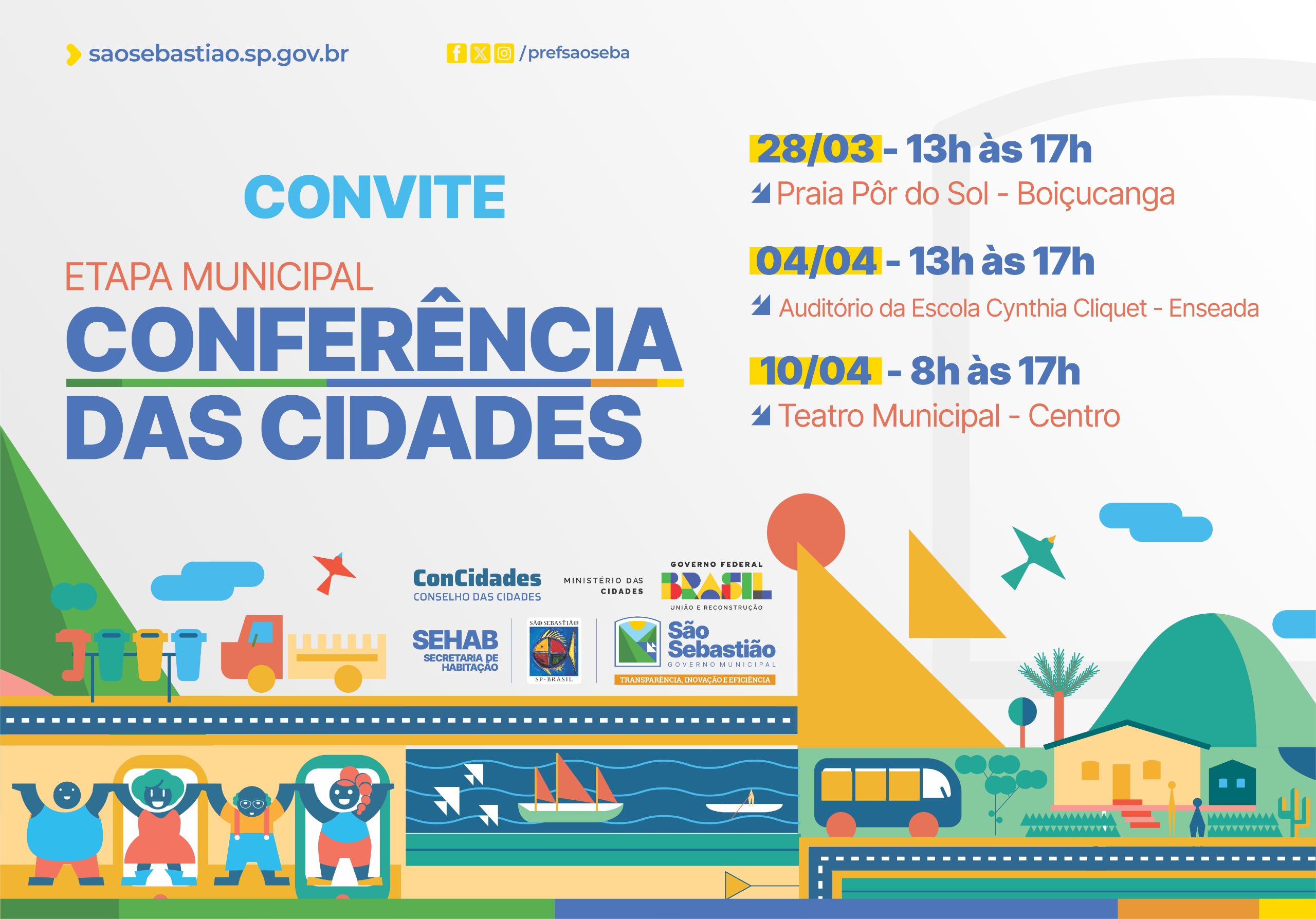 A Prefeitura de São Sebastião, por meio da Secretaria de Habitação e Regularização Fundiária (Sehab), realiza nos meses de março e abril a Etapa Municipal da Conferência das Cidades. Esta é a primeira vez que o município realiza o evento que vai permitir eleger sete delegados que irão para as fases estadual e nacional.
