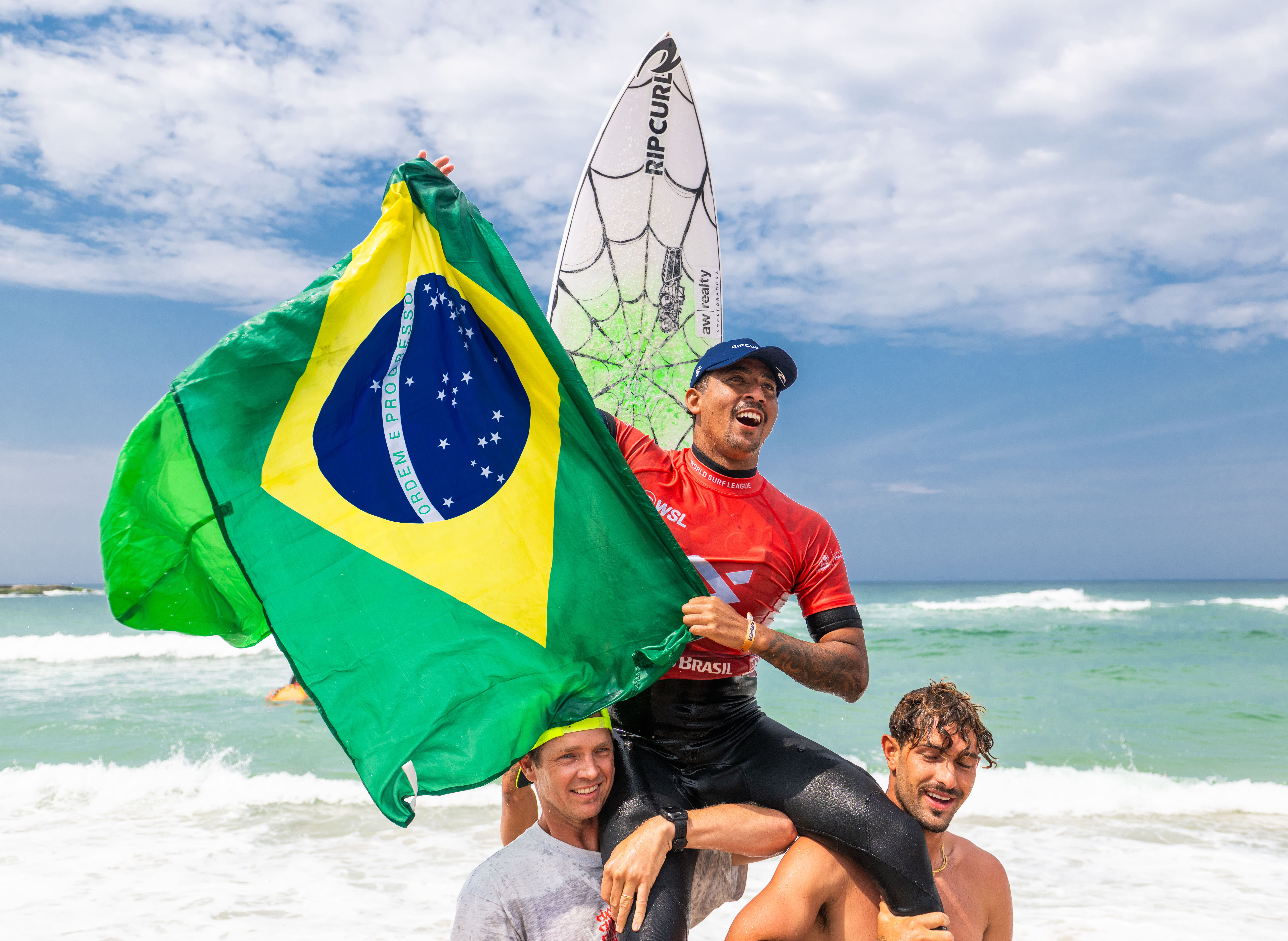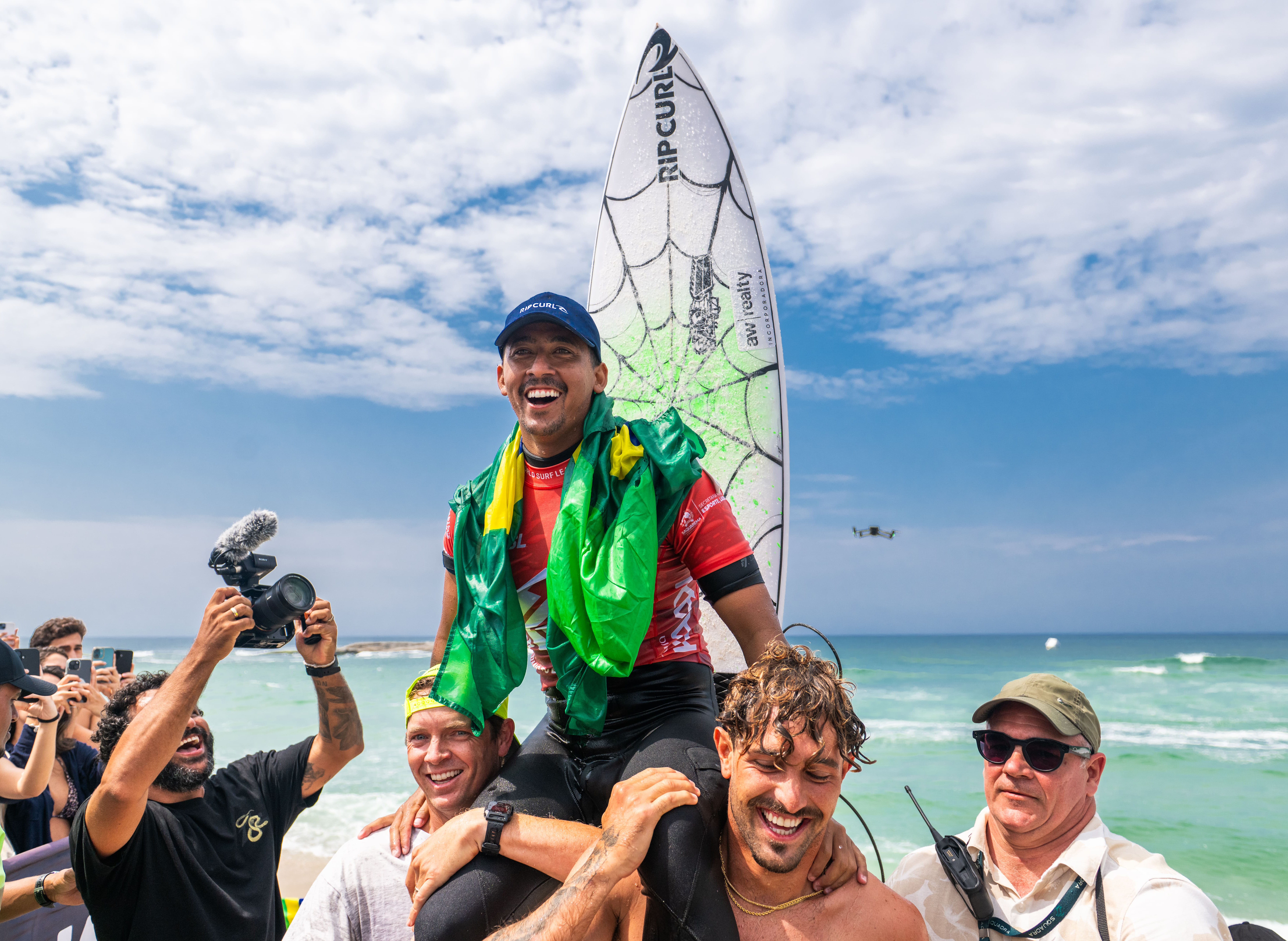 #PraTodosVerem: Nas imagens, o surfista sebastianense Samuel Pupo aparece em ação nas ondas, executando manobras precisas durante a etapa do Challenger Series. Em seguida, é carregado pelos colegas na areia, envolto na bandeira do Brasil e comemorando a vitória com um sorriso de emoção e orgulho. Samuel também segura o troféu de campeão diante do painel oficial do evento, simbolizando a conquista da etapa e o destaque do atleta de São Sebastião no cenário internacional do surfe. Fim da descrição.
