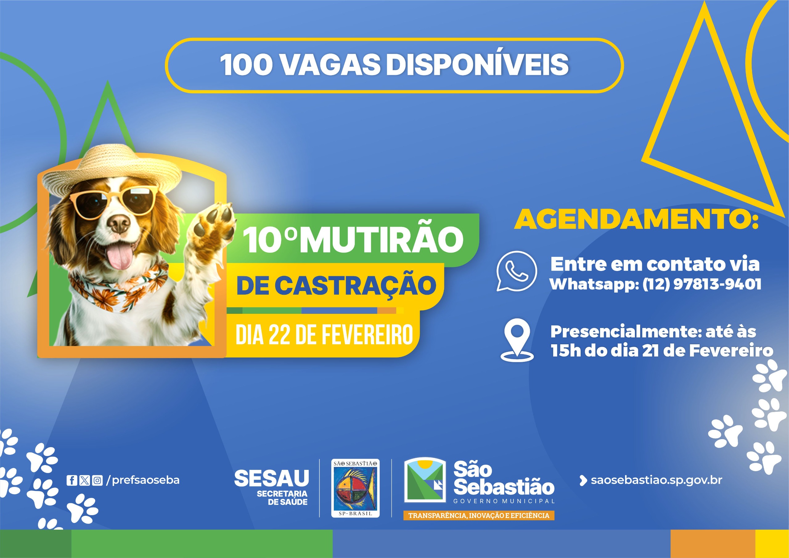 A Prefeitura de São Sebastião por meio da Secretaria de Saúde (Sesau), realiza o 10º Mutirão de Castração no Pronto Atendimento e Tratamento Animal (PATA) no sábado dia (22). Com início às 8h, a ação oferecerá 100 vagas para castração de cães e gatos, exclusivamente para moradores do município, mediante agendamento prévio.