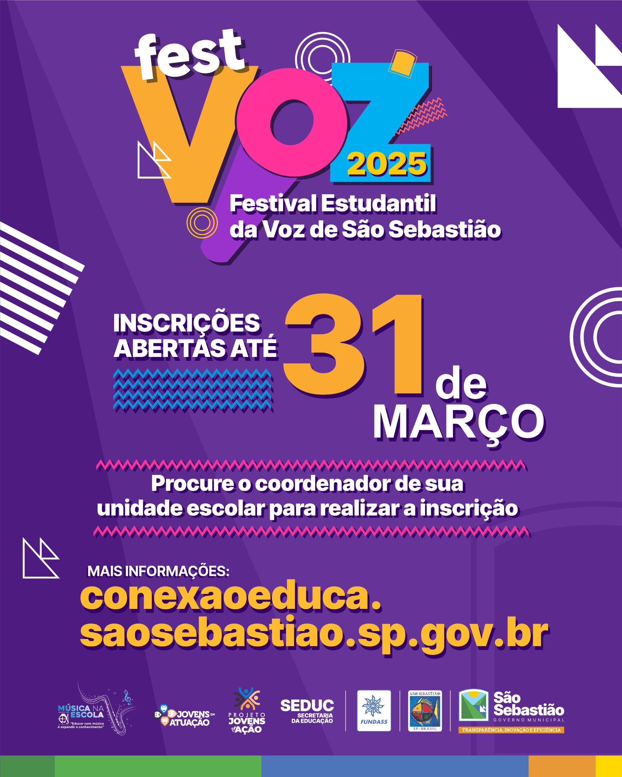A Prefeitura de São Sebastião, por meio da Secretaria da Educação, abriu as inscrições para o FestVoz 2025, o Festival Estudantil da Voz do município. A iniciativa é realizada pelos projetos Jovens em Ação, Jovens em Atuação e Música na Escola, em parceria com a Fundação Educacional e Cultural Deodato Sant’Anna (Fundass). O festival tem como objetivo incentivar o talento musical dos estudantes, promover a cultura musical e contribuir para o desenvolvimento artístico e cultural dos alunos.