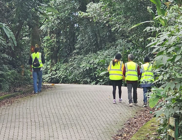 #PraTodosVerem: As imagens mostram uma rua estreita e pavimentada com blocos de concreto, ladeada por muros e muita vegetação de mata nativa. Em ambas as fotos aparecem pessoas vestindo coletes de segurança refletivos amarelos, caminhando em grupo pelo caminho arborizado. Na primeira foto, um trabalhador está em frente a um portão metálico azul com cobertura vermelha, enquanto outros seguem mais adiante em direção a uma van branca estacionada. Na segunda foto, o grupo de pessoas caminha pela via sinuosa, cercada por árvores altas e densa vegetação verde, reforçando o cenário de área de mata. Fim da descrição.