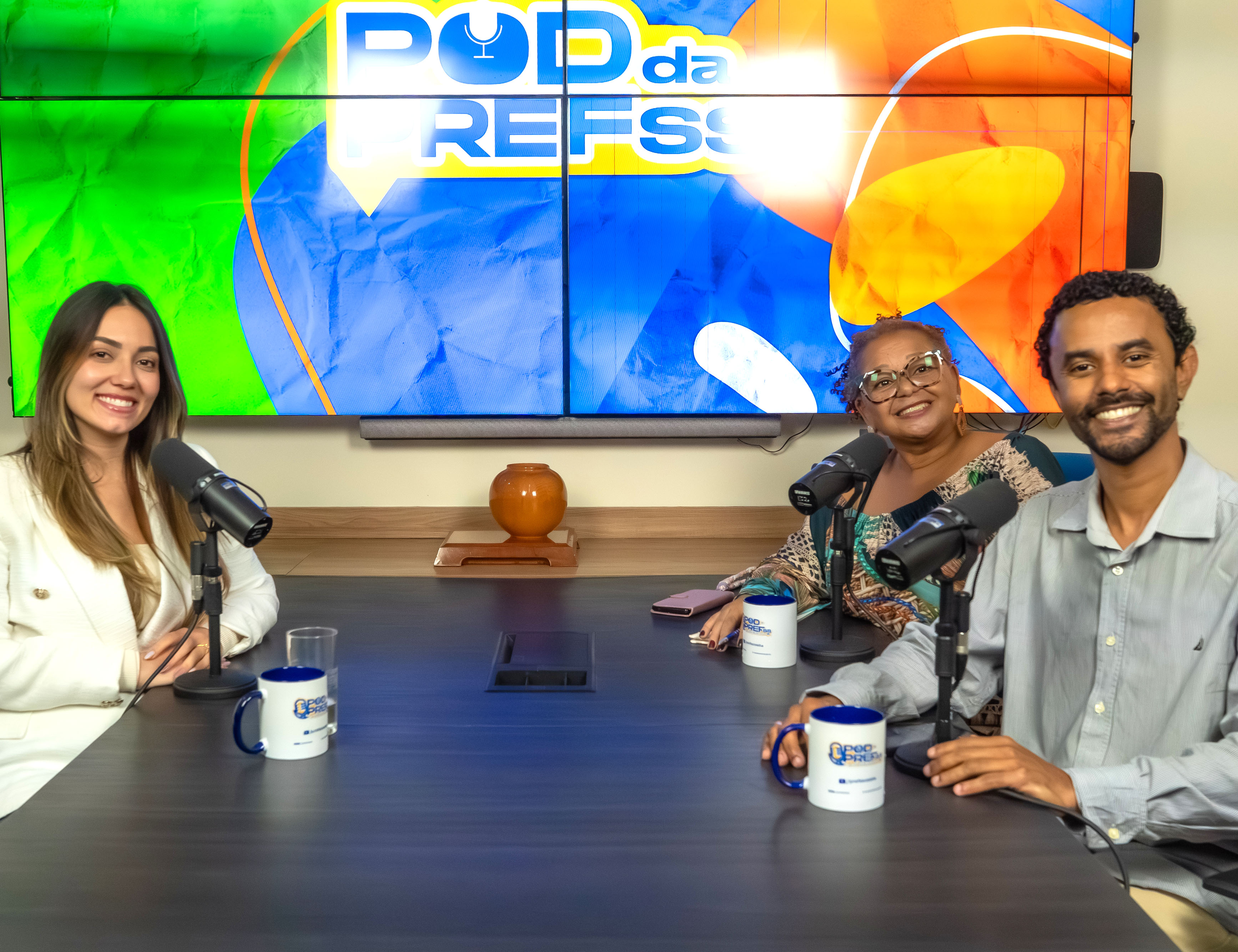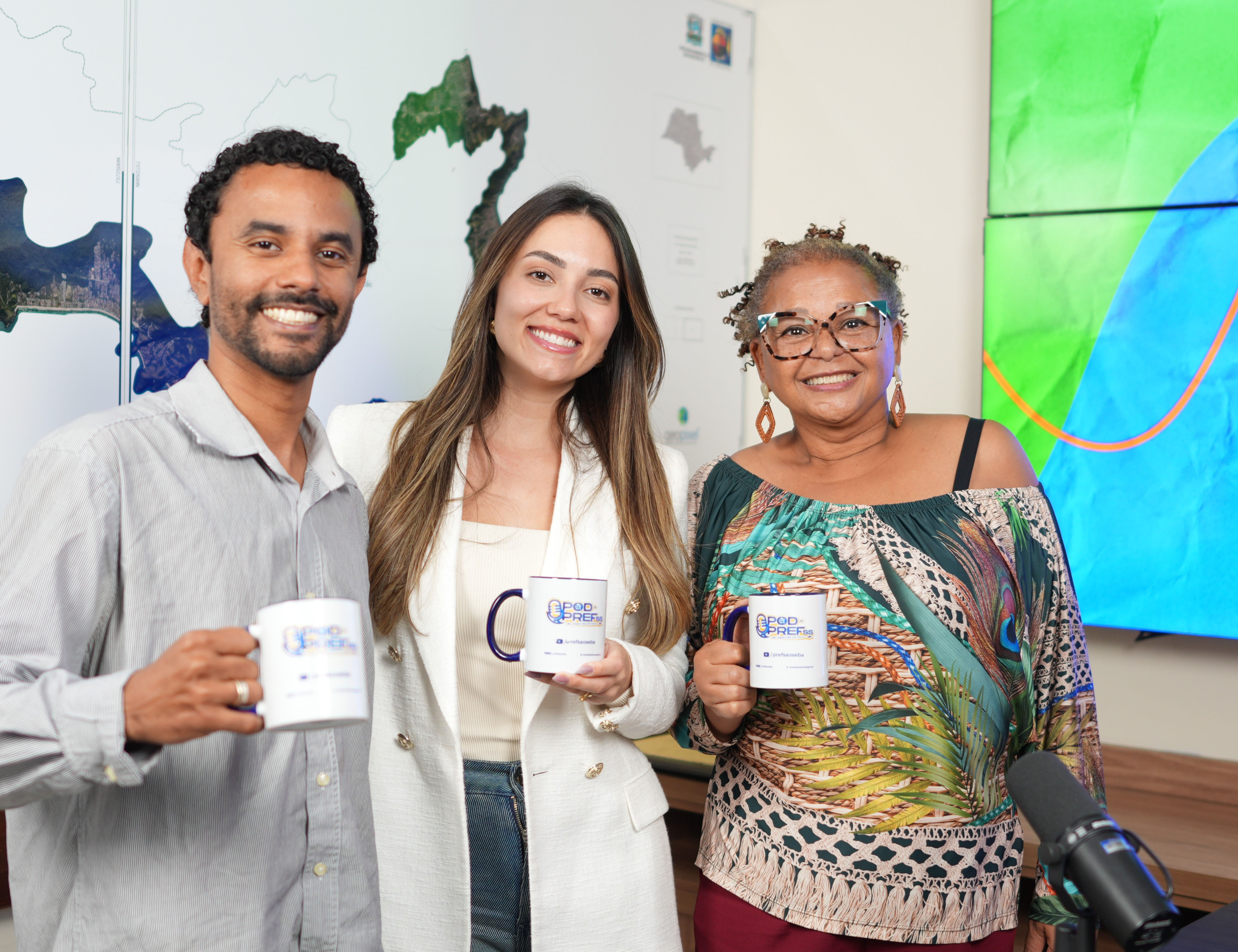 #PraTodosVerem: Os apresentadores do Pod da PrefSS, Rafael César e Mara Cirino, posam ao lado da primeira-dama e presidente do Fundo Social de Solidariedade de São Sebastião, Taiana Prado, durante a gravação do 26º episódio do programa. Em clima descontraído, eles brindam com as canecas personalizadas do podcast. Em outro registro, Taiana aparece sorridente, segurando a caneca do Pod da PrefSS, durante a entrevista em que fala sobre as ações do Fundo Social e os desafios de conciliar a vida pública com a pessoal. Fim da descrição.