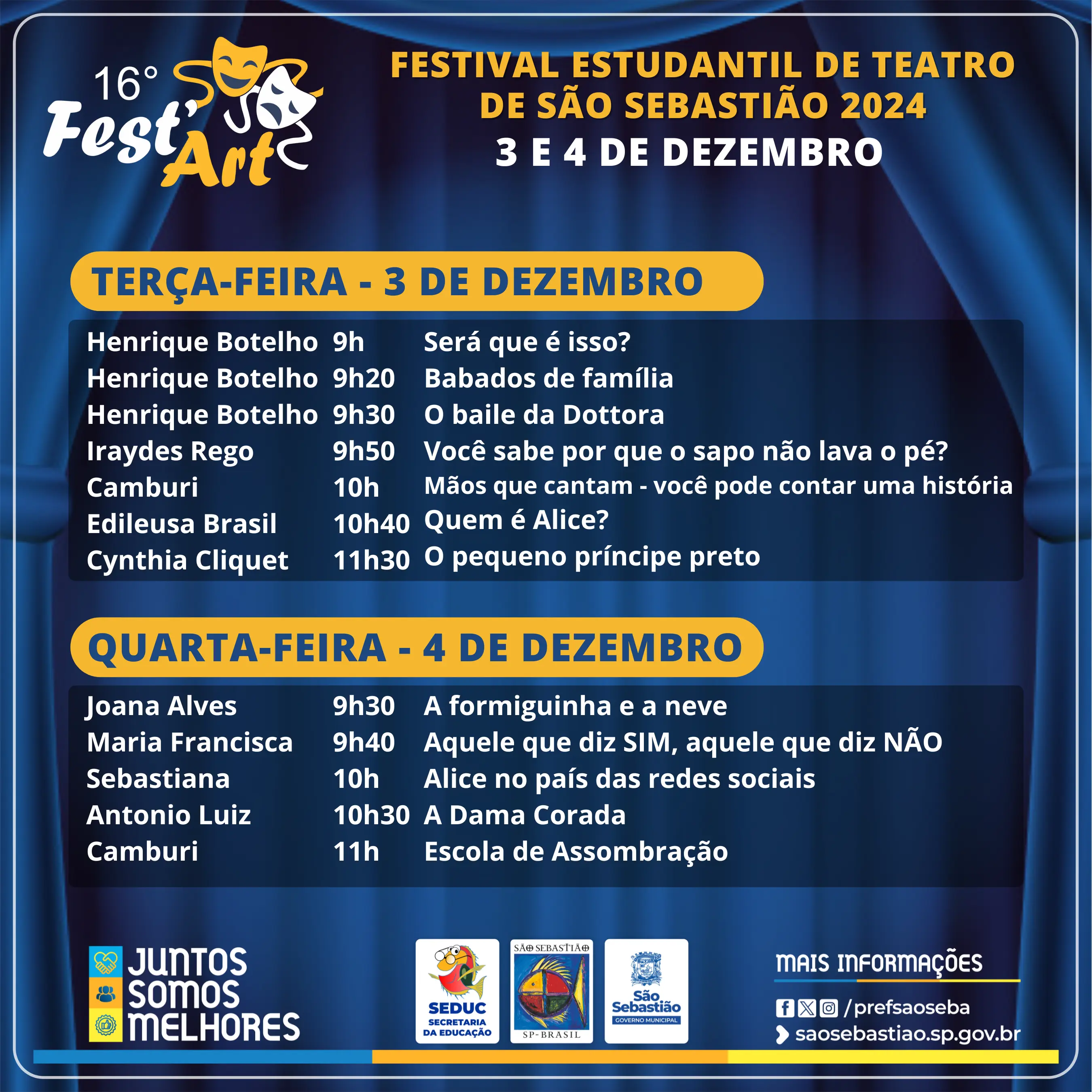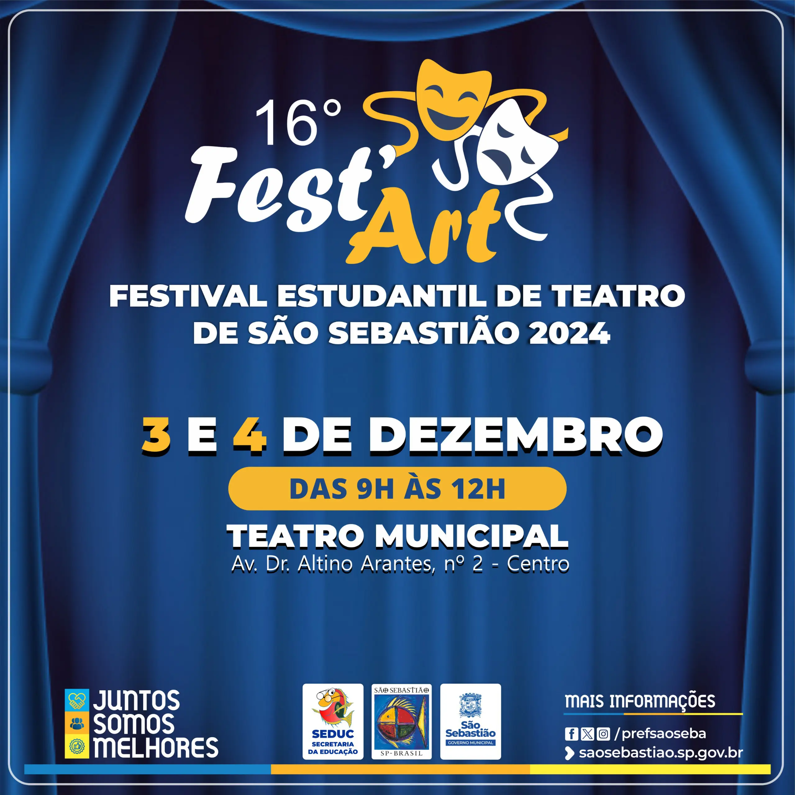 #PraTodosVerem: arte de divulgação do 16º FestArt – Festival Estudantil de Teatro de São Sebastião 2024. O fundo é azul com cortinas de teatro. O título "16º Fest'Art" aparece em destaque, com as datas "3 e 4 de dezembro" e o horário "Das 9h às 12h". O evento será no "Teatro Municipal, Av. Dr. Altino Arantes, nº 2 – Centro". A arte também inclui os logotipos da Prefeitura, Secretaria da Educação e parceiros. Fim da descrição.