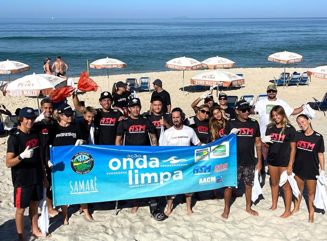 #PraTodosVerem: Ondas fortes e bem desenhadas quebram em Maresias, cenário que também ilustra o material de divulgação do ASM Surf Festival, marcado para o dia 3 de dezembro (quarta-feira), na entrada 15 da praia, reunindo atletas e amantes do surfe em mais uma grande celebração do esporte, enquanto, no mar, surfistas remam em meio ao swell próximo à costeira, em um ambiente de natureza intensa e esportividade. Em outra foto, é mostrado um dia ensolarado na praia, um grupo de aproximadamente quinze voluntários, a maioria vestindo camisetas pretas com a sigla "ASM", luvas brancas e alguns bonés, está posando na areia clara para uma foto coletiva. Fim da descrição.