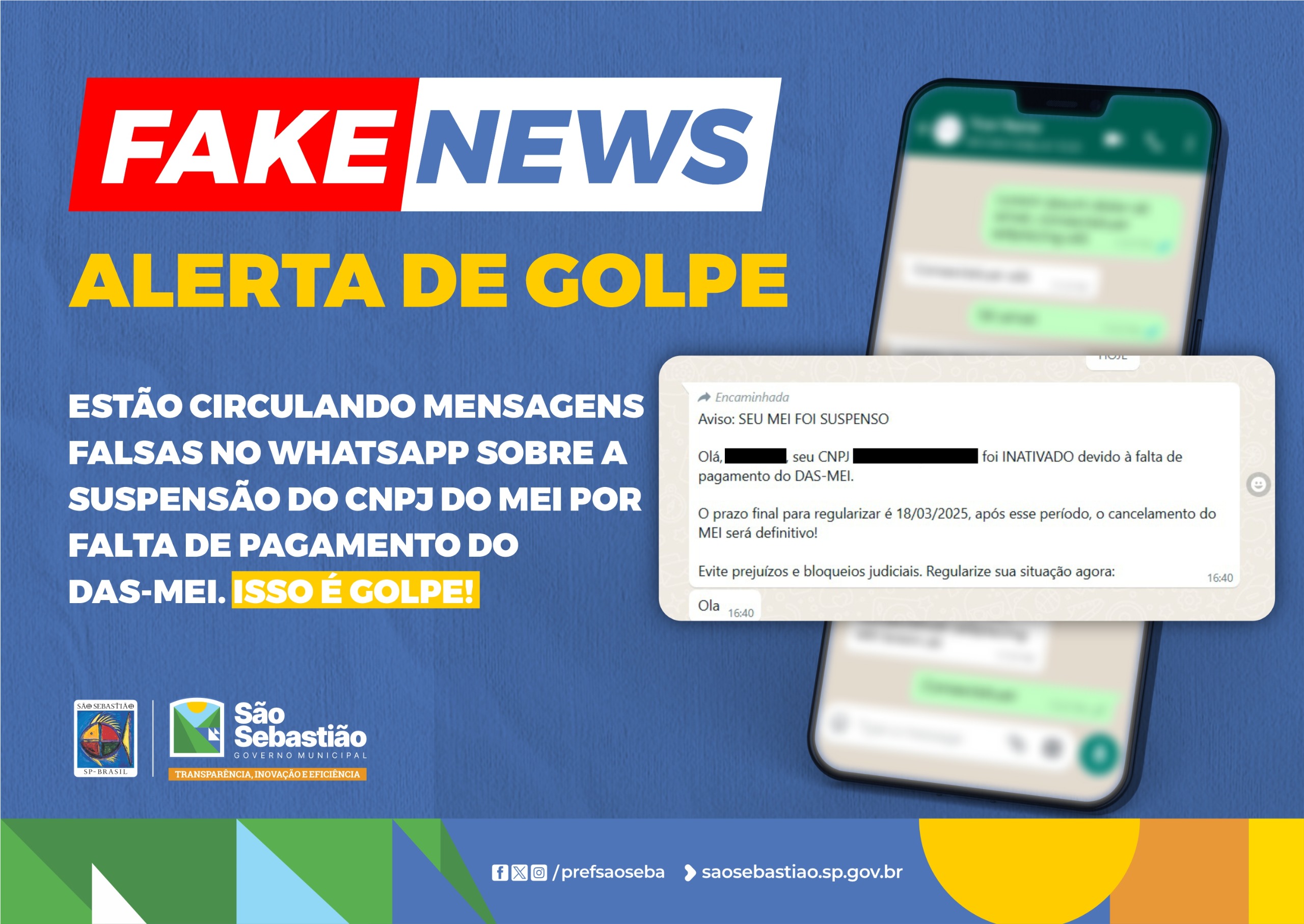 A Prefeitura de São Sebastião, por meio da Secretaria de Desenvolvimento Econômico e Social (Sedes), alerta sobre a circulação de mensagens falsas no WhatsApp relacionadas à suspensão do CNPJ de Microempreendedores Individuais (MEI) por falta de pagamento do DAS-MEI.