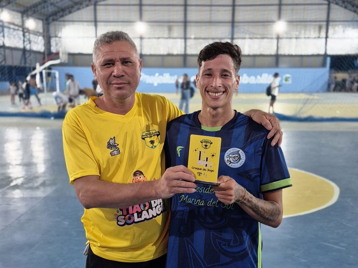 #PraTodosVerem: As imagens registram momentos da Copa Maresias de Futsal, com as equipes posando uniformizada em quadra antes da partida e jogadores mostrando concentração e união para o confronto, enquanto em outra cena o destaque vai para o atleta eleito “Craque do Jogo”, que aparece sorridente ao lado de um organizador do torneio segurando a placa de premiação, simbolizando o reconhecimento pelo bom desempenho dentro de quadra. Fim da descrição.