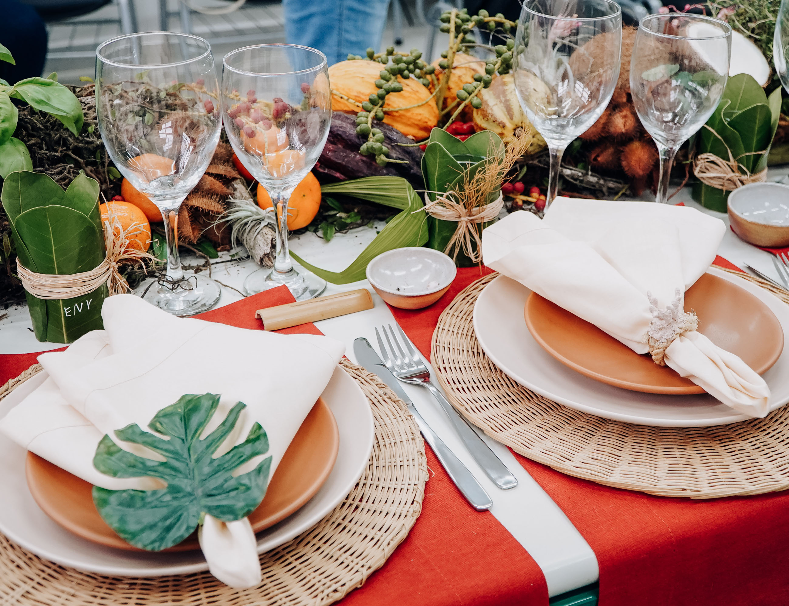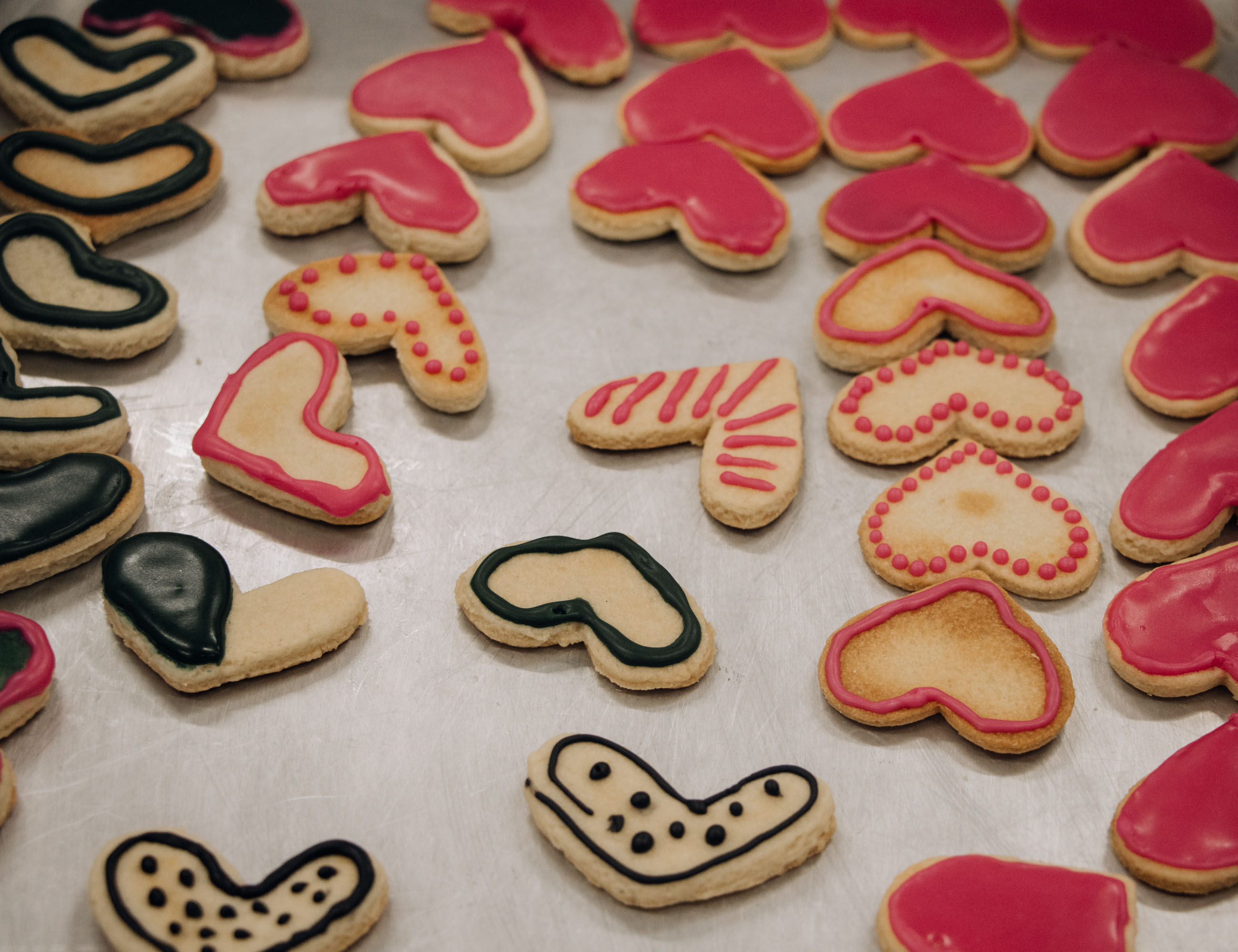 #ParaTodosVerem: Mesa posta com decoração natural em tons terrosos, com pratos de cerâmica, guardanapos brancos e arranjo central de folhas e frutas; grupo de mulheres em aula prática de culinária, todas com toucas ouvindo a instrutora em uma cozinha industrial; e biscoitos em formato de coração decorados com glacê colorido em rosa, preto e bege sobre uma assadeira de inox. Fim da descrição.