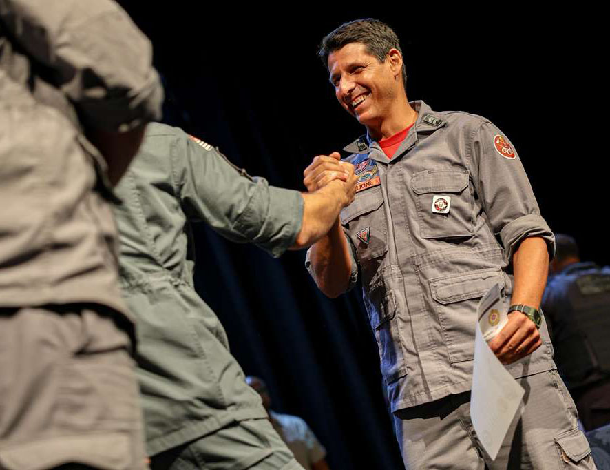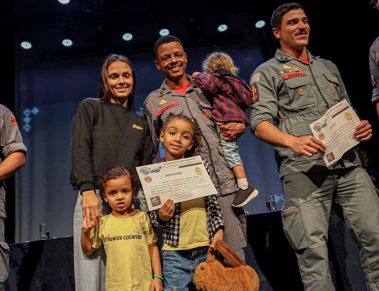 #PraTodosVerem: As imagens mostram uma cerimônia de formatura e entrega de certificados a integrantes do Corpo de Bombeiros. Em um auditório iluminado, bombeiros fardados posam para fotos e recebem cumprimentos. Em uma das fotos, um bombeiro sorri e aperta a mão de um colega; em outra, o grupo inteiro de formandos posa em frente ao palco com bandeiras ao fundo. Também há registros de bombeiros acompanhados de familiares, inclusive crianças segurando certificados, e de grupos menores sendo diplomados e fotografados juntos no palco. Fim da descrição.
