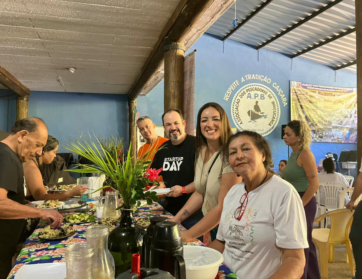 #PraTodosVerem: As fotos mostram um almoço comunitário realizado em um salão com paredes azuis e estrutura de madeira, decorado com flores tropicais sobre uma mesa coberta por toalha colorida. Na primeira imagem, uma mulher sorri segurando um grande prato de mexilhões preparados, vestindo avental preto e uma faixa na cabeça. Na segunda, várias pessoas se servem na mesa, pegando pratos e alimentos em clima descontraído. Na terceira imagem, um grupo de homens e mulheres posa sorridente em frente à mesa, ao fundo um banner da Associação dos Pescadores de Boicucanga destaca a valorização da tradição caiçara. Fim da descrição.