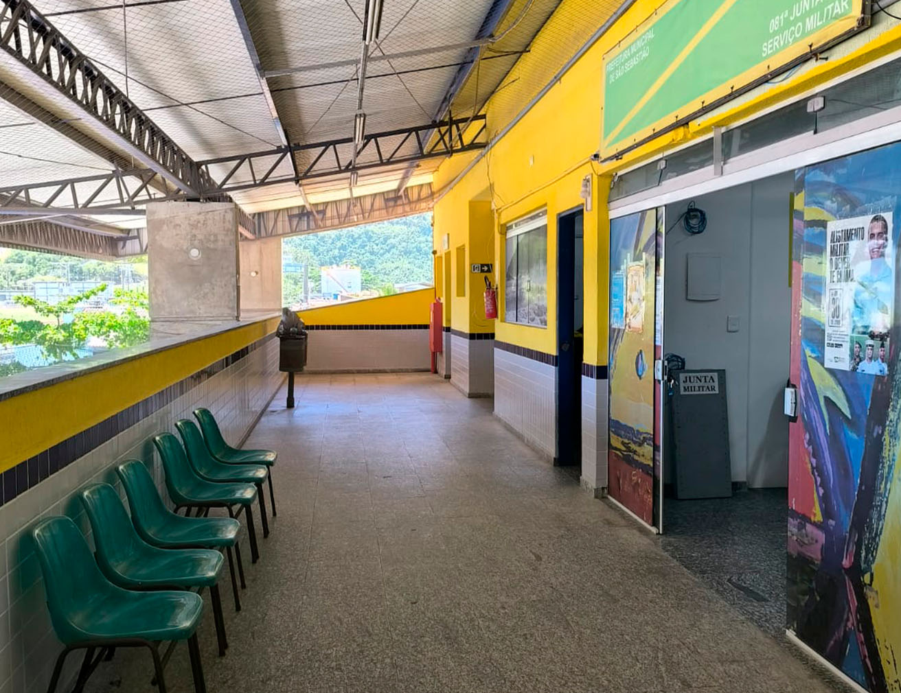 #PraTodosVerem: conjunto de imagens sobre o Serviço Militar no Brasil. A primeira mostra um cartaz com dois militares em silhueta, usando fardas camufladas, capacetes e portando fuzis, com o texto “Serviço Militar. Se você faz 18 anos neste ano, aliste-se de 1º jan a 30 jun” e o endereço “alistamento.eb.mil.br”. As imagens seguintes mostram o corredor e a entrada de uma Junta de Serviço Militar, com paredes amarelas, cadeiras verdes alinhadas para espera, piso cinza e cobertura metálica no teto; na fachada há uma placa verde e amarela com a inscrição “Prefeitura Municipal de São Sebastião – 081ª Junta de Serviço Militar”, portas abertas com cartazes informativos sobre alistamento e, no interior, um pequeno espaço de atendimento com banco para sentar. Fim da descrição.