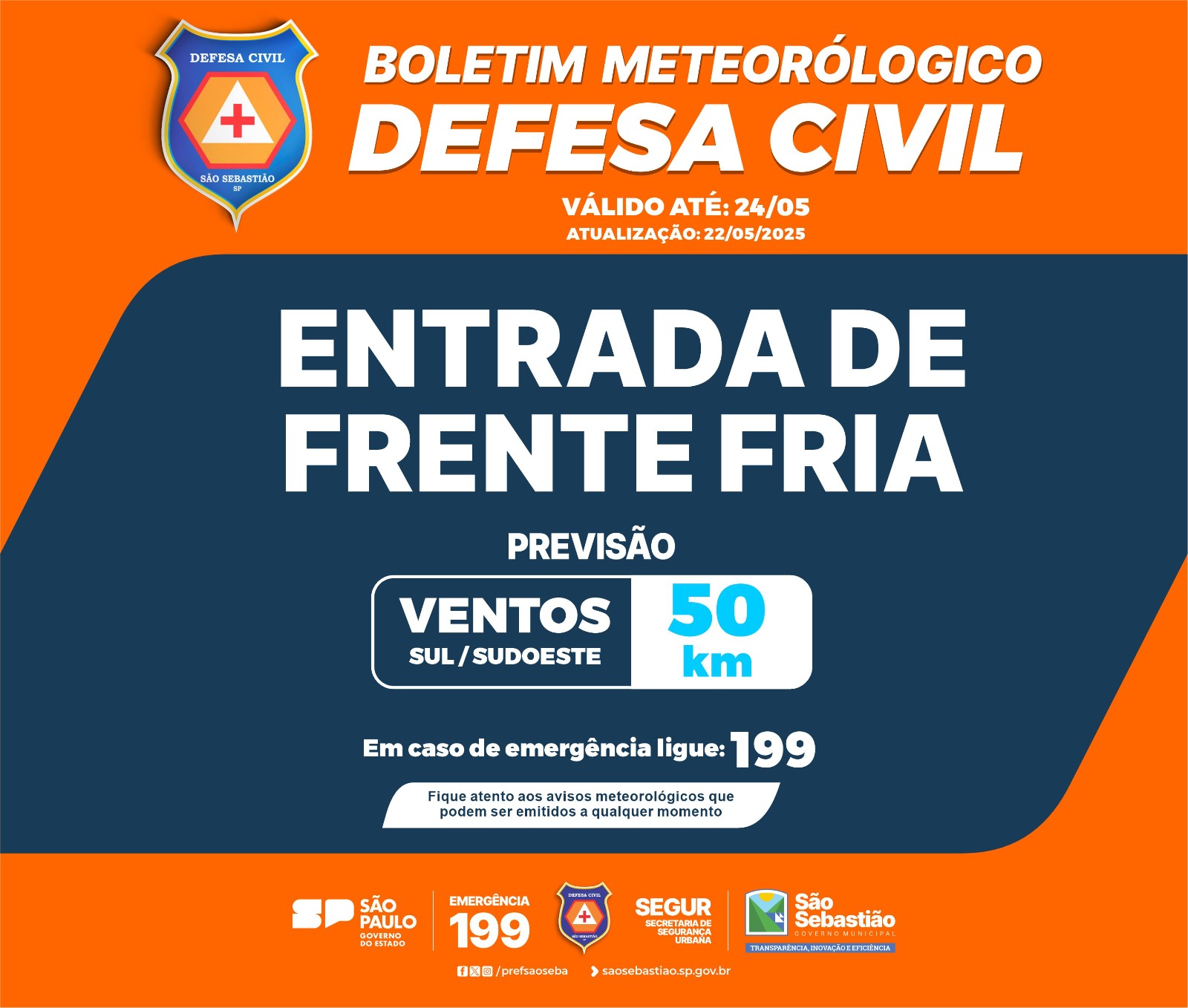 A Defesa Civil de São Sebastião emitiu um alerta para a chegada de uma frente fria pelo oceano a partir desta quinta-feira (22/5) e que deve derrubar as temperaturas nesses dias típicos de outono.