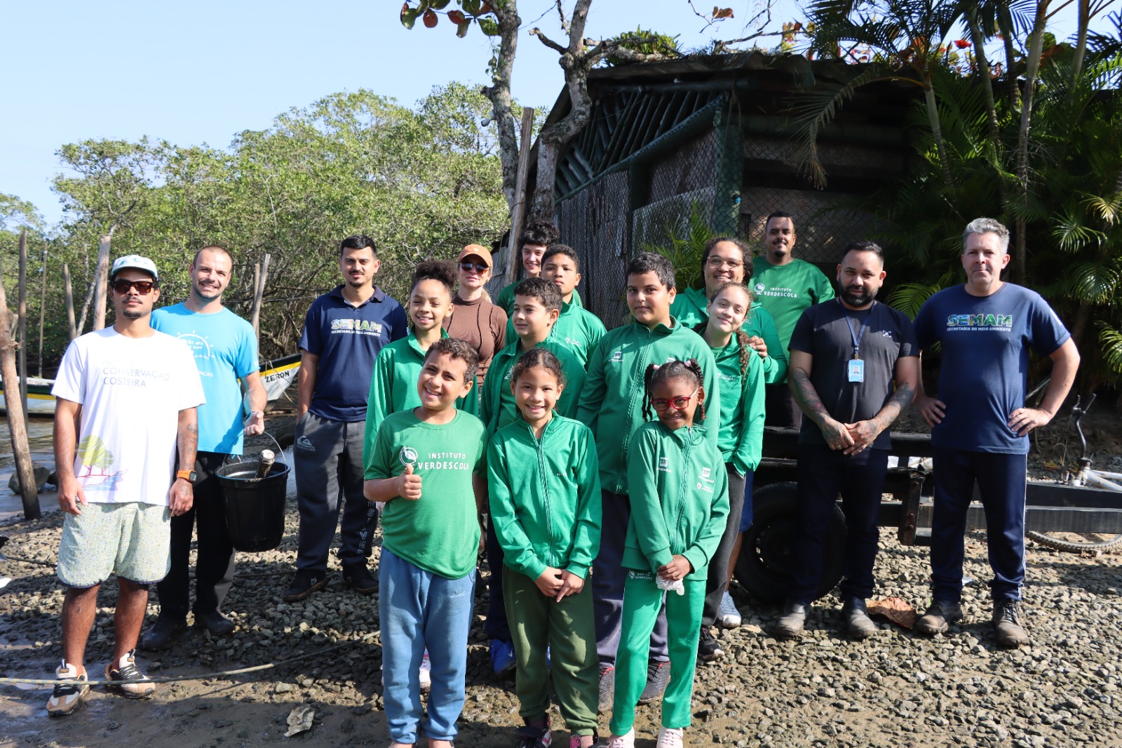 As crianças participantes também puderam participar do plantio de mudas de mangue vermelho (Rizophora) – espécie frequentemente observada nas florestas de mangue. A iniciativa reforça a importância da conscientização ambiental e da ação coletiva para preservar os manguezais, ecossistemas fundamentais para a biodiversidade costeira e o equilíbrio climático.