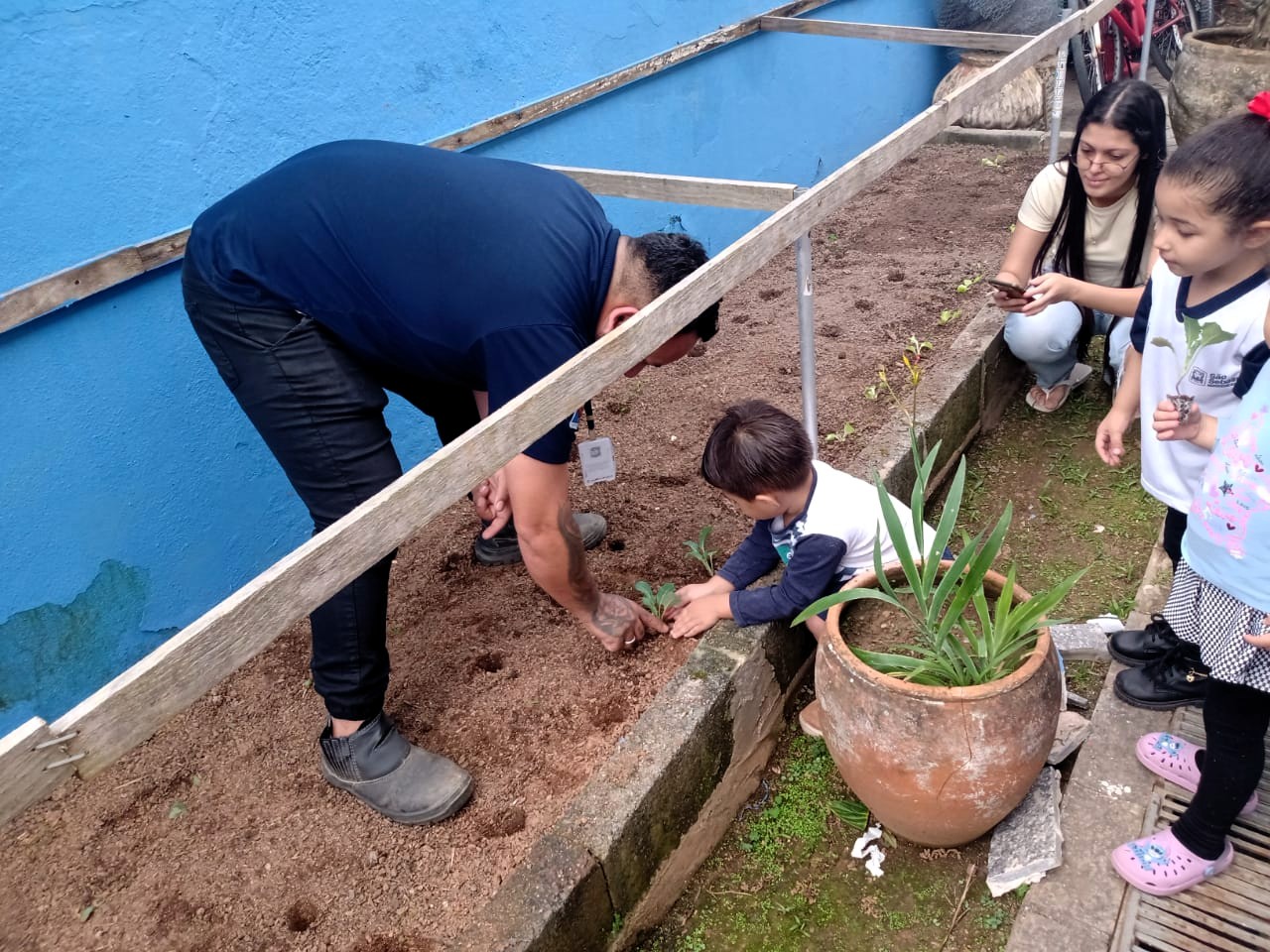 Na creche, participaram do plantio 23 alunos de um a quatro anos, uma professora, uma coordenadora escolar e um servidor da Semam como apoio. Foram plantadas 80 mudas de diversas hortaliças, como salsinha, alface, cebolinha e couve.
