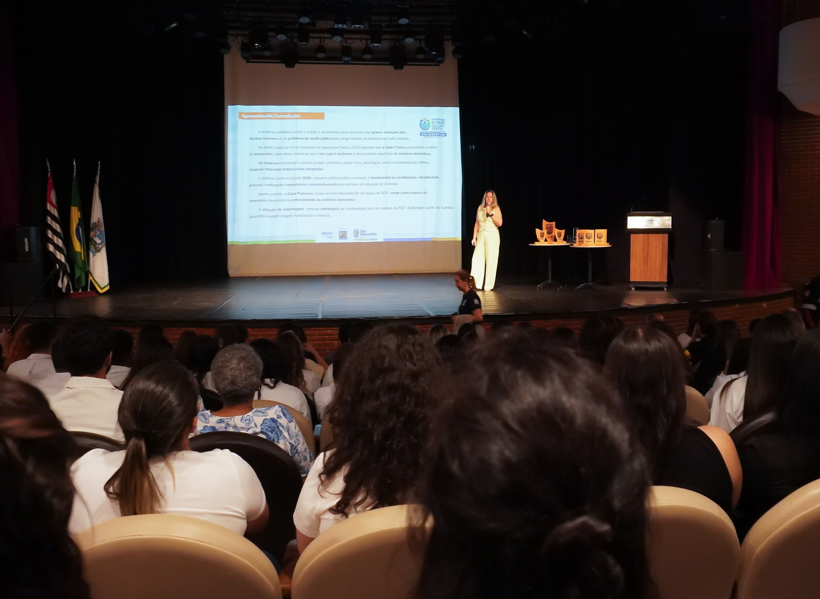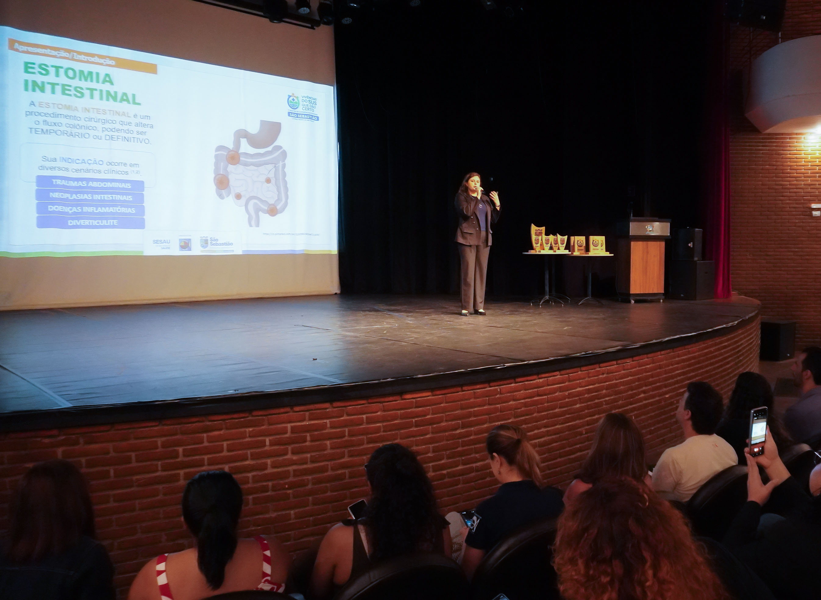 #PraTodosVerem: 1ª Mostra de Experiências Exitosas Vivências do SUS que dão Certo reuniu profissionais da saúde e público em geral nesta segunda-feira (21/09), no Teatro Municipal, que ficou lotado. Fim da descrição.