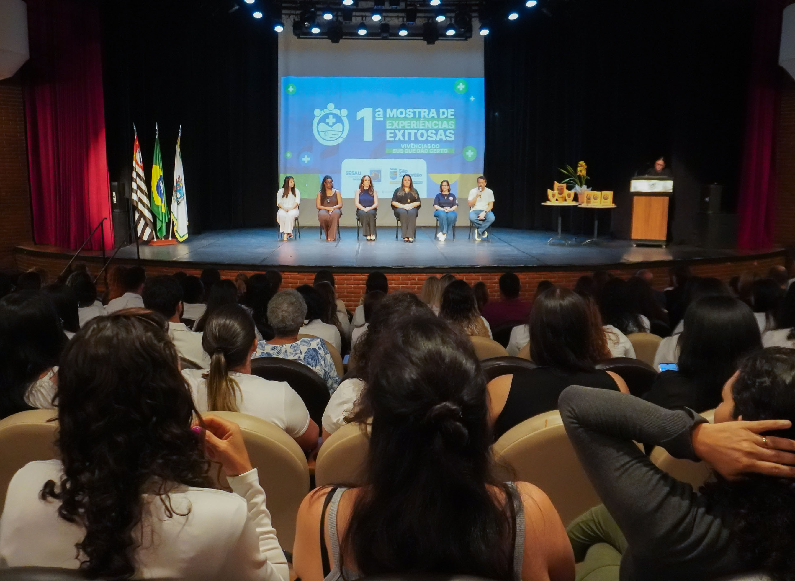 A Prefeitura de São Sebastião, por meio da Secretaria de Saúde (Sesau), realizou nesta segunda-feira (21/9) a 1ª Mostra de Experiências Exitosas ‘Vivências do SUS que dão Certo’, no Teatro Municipal, no Centro. A exposição é um compilado de 40 projetos inscritos que são aplicados na rede pública municipal. Desse total, 18 foram selecionados por uma banca de professores da Faculdade Módulo e apresentados ao público, que lotou o teatro.