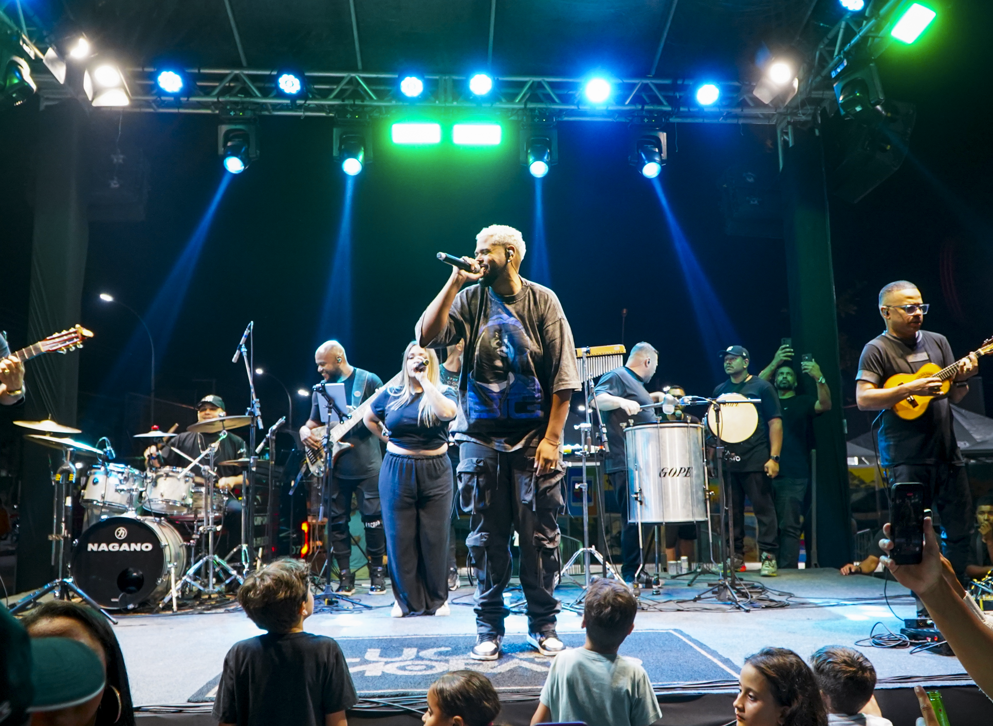 #PraTodosVerem: imagem da banda do cantor Lucas Morato, composta pelos integrantes em cima do palco tocando seus instrumentos durante apresentação, a segunda imagem um pouco, mas distante também da banda, com o público a frente do palco, e a última imagem do grupo Samba Caiçara e seus componentes durante a abertura do show. Fim da Descrição.