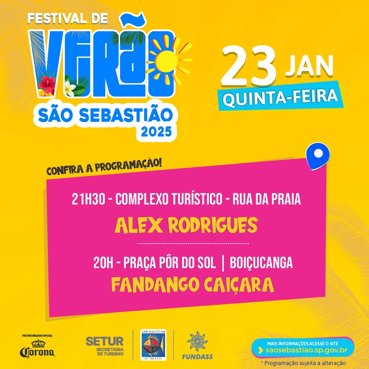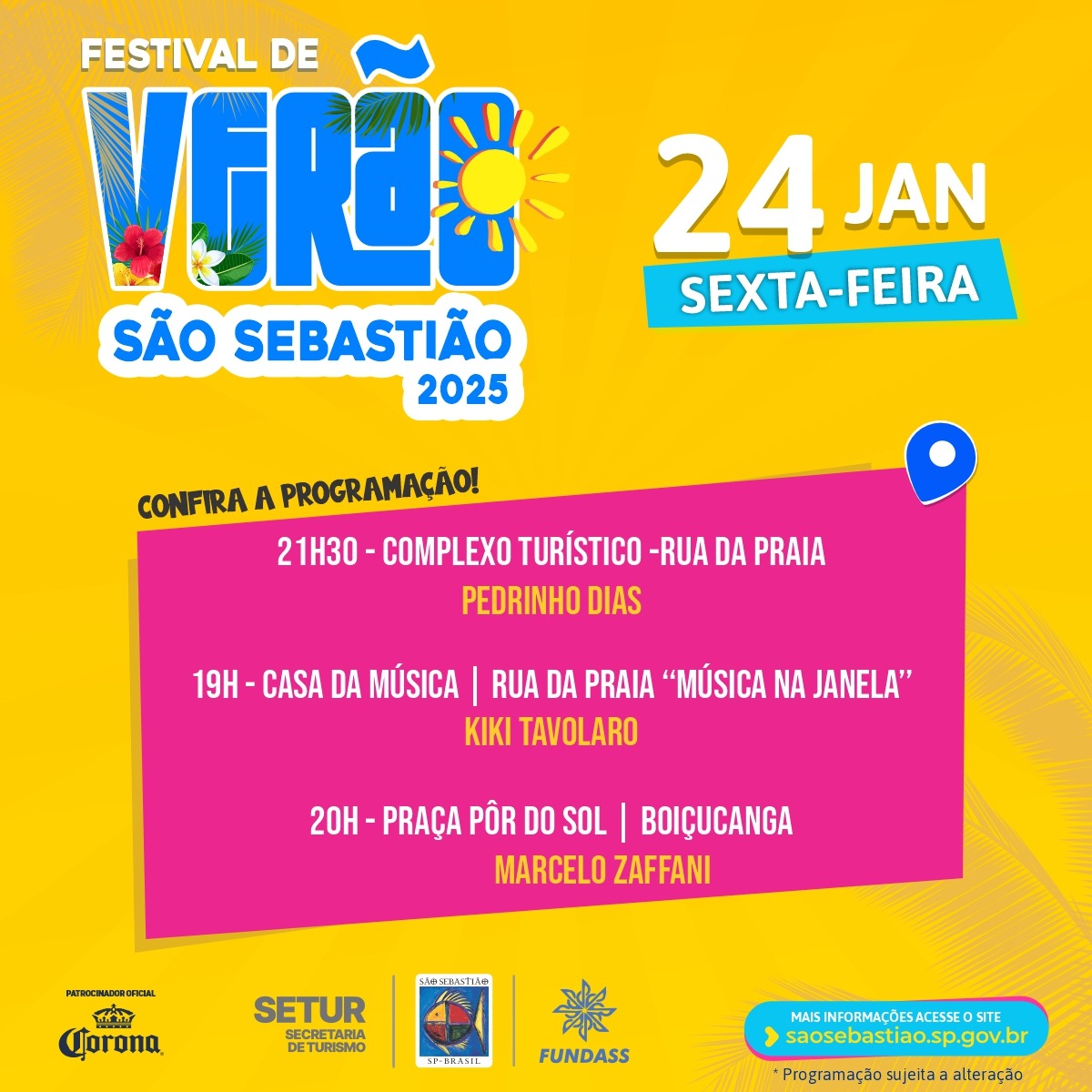 A Prefeitura de São Sebastião, por meio da Secretaria de Turismo (SETUR) e da Fundação Educacional e Cultural ‘Deodato Sant’Anna’ (Fundass), com patrocínio da Corona, segue com o Festival de Verão de São Sebastião 2025.