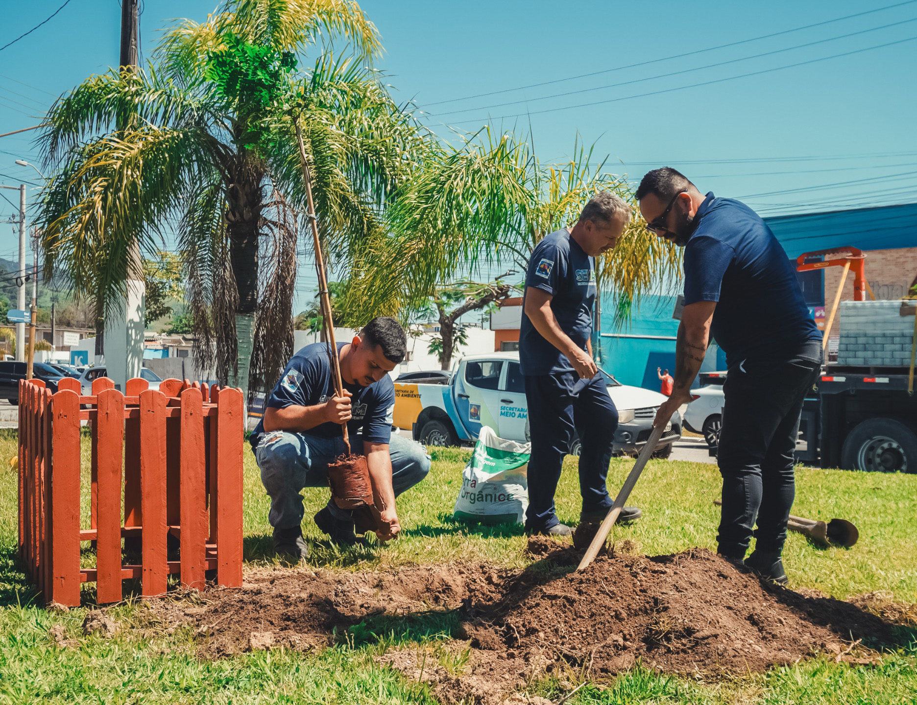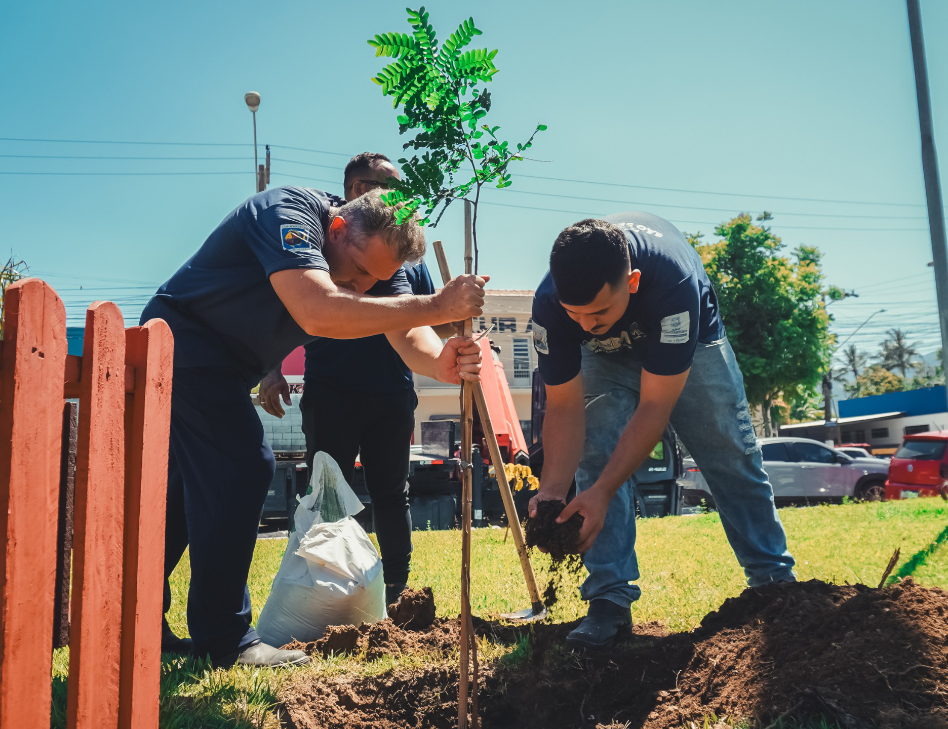 #PraTodosVerem: As imagens registram a ação de plantio da milésima árvore do Programa de Arborização Urbana 2025 da Prefeitura de São Sebastião, mostrando servidores municipais durante o preparo do solo, o posicionamento da muda de pau-brasil, o uso de ferramentas e insumos para o plantio e a fixação da proteção de madeira identificada com o nome da espécie, em uma área verde urbana cercada por vias públicas, residências e comércios, sob céu aberto, evidenciando o cuidado técnico, o trabalho em equipe e o compromisso do município com a preservação ambiental e a ampliação das áreas arborizadas da cidade. Fim da descrição.