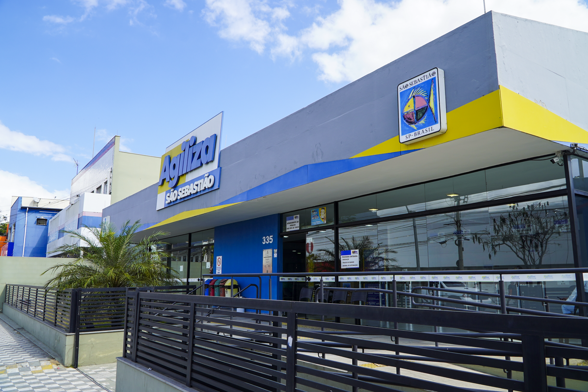 #PraTodosVerem: O conjunto de imagens apresenta fachadas de órgãos públicos em São Sebastião. A primeira mostra uma vista aérea de um casarão colonial com paredes amarelas, detalhes azuis e telhado de barro, rodeado por carros; a segunda foca no centro Agiliza São Sebastião, um prédio azul e cinza com amplas janelas de vidro e rampa; a terceira traz a Unidade de Pronto Atendimento (UPA 24h) com pastilhas verdes e carros no estacionamento. Fim da descrição.