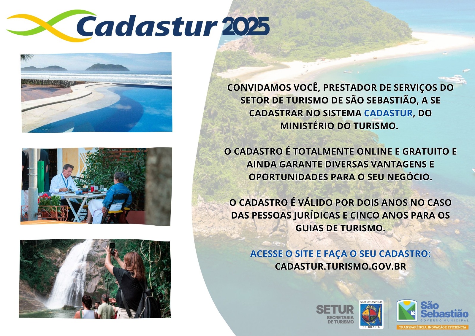 Os servidores públicos do Observatório de Turismo da Secretaria Municipal de Turismo de São Sebastião iniciaram uma campanha de cadastramento e recadastramento no sistema Cadastur, sistema executado pelo Ministério do Turismo. Como parte da iniciativa, os funcionários estão visitando estabelecimentos da cidade, como hotéis, pousadas e o setor de alimentação fora do lar — incluindo restaurantes, bares, lanchonetes, pizzarias e cafeterias — para orientar e instruir os proprietários e responsáveis sobre como realizar o cadastro no sistema.