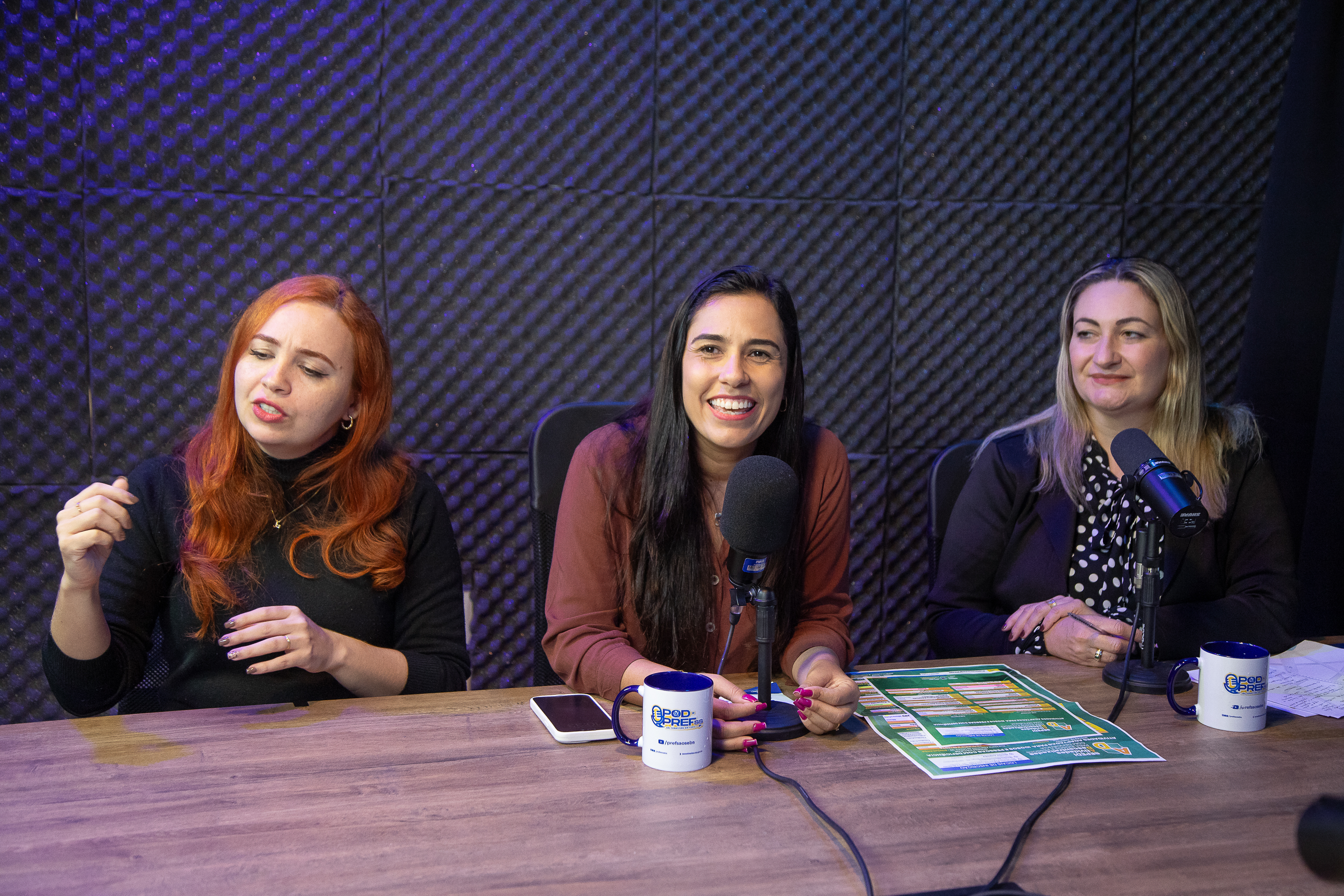 #PraTodosVerem: Imagens coloridas mostram a gravação de um episódio do podcast “Pod da PrefSS”, em estúdio com isolamento acústico nas paredes e iluminação azul. Na primeira imagem, cinco pessoas estão sentadas ao redor de uma mesa de madeira, conversando e sorrindo diante de microfones e câmeras. No centro, uma tela exibe o logotipo do programa. Na segunda imagem, Juliana Batista, Juliana Coelho e Lidiane Sacardo, sentadas lado a lado estão em destaque: a primeira, ruiva, veste blusa preta e faz gestos com as mãos; a segunda, de cabelos longos e escuros, veste blusa marrom e sorri para a câmera; e a terceira, loira, usa blazer preto com camisa de bolinhas. Na terceira imagem, as três aparecem em pé, segurando canecas personalizadas do podcast e sorrindo. Na última, os apresentadores Mara Cirino e Rafael César estão em pé ao lado das convidadas. Fim da descrição
